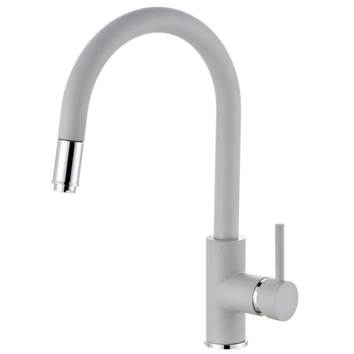 Páková kuchynská batéria Delos s vyťahovacou koncovkou prevedenie granital farba šedá (81 Concrete) rozmer 207 x 380 mm dĺžka výtoku 207 mm komfortná zóna 194 mm ovládanie pákou jednootvorová montáž otočné ramienko vyťahovacia koncovka rozeta priemer 50 mm pripojenie 3/8′ G