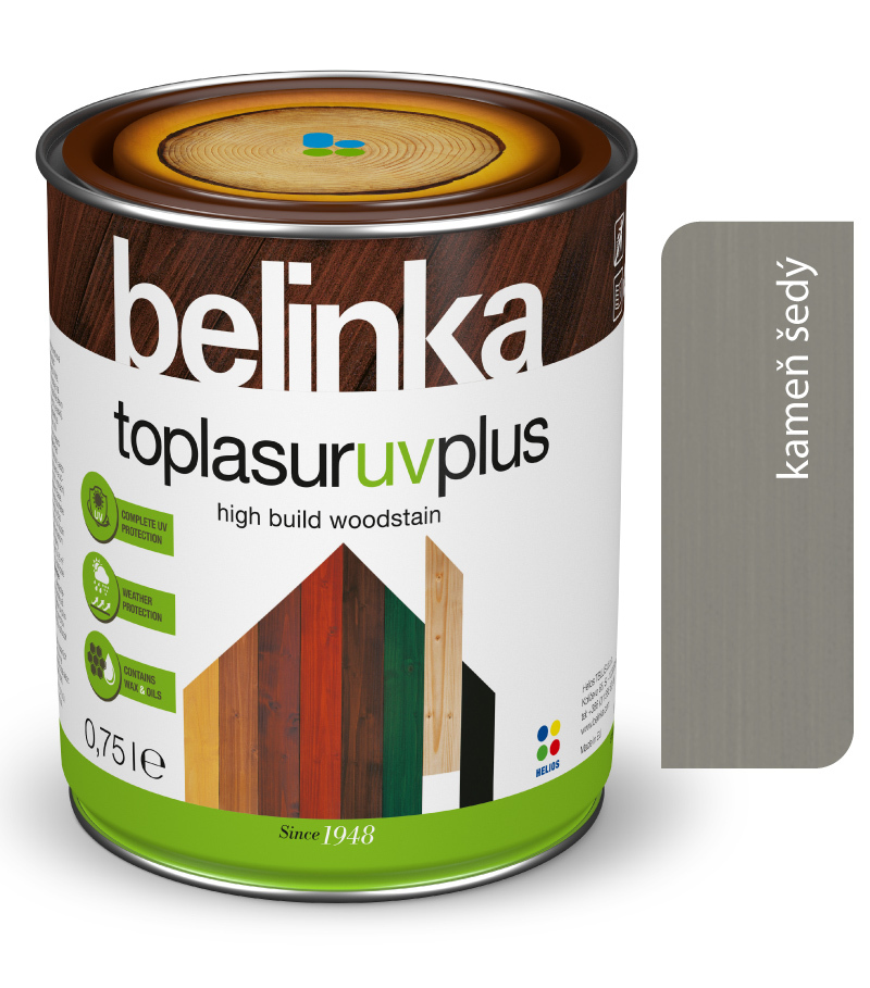 Belinka Toplasur je vysokokvalitná hrubovrstvá lazúra na drevo. Toplasur UV Plus je vysoko stály náter na dlhodobú ochranu dreva pred poveternostnými vplyvmi. Zároveň dekoratívne zafarbí a zušľachtí drevené povrchy. Osobitne vhodný je na ochranu dreva, ktoré je exponované náročnejším poveternostným podmienkam (slnku, ultrafialovému žiareniu, dažďu, mrazu).Vlastnosti Belinka Toplasur UV Plus: hrubovrstvový lazúrový náter pekne zvýrazní štruktúru dreva poskytuje drevu hodvábny vzhľad je tixotropný, preto sa jednoducho roztiera a nesteká zo štetca obsahuje UV filtre a UV absorbéry, dobre chráni drevo pred nepriaznivými slnečnými lúčmi náter sa neodlupuje a jednoducho sa renovuje Oblasti použitia Belinka Toplasur UV Plus:Používame ho na povrchovú ochranu všetkých druhov dreva, v budove a mimo budovy. Osobitne vhodný je na ošetrenie okien, dverí, pretože zvyšuje ich rozmerovú stabilitu, a na ochranu tvrdých druhov dreva listnatých stromov.Pracovný postup náteru Belinka Toplasur UV Plus: Príprava podkladu: Nové drevo musí byť suché (vlhkosť dreva cca. 15 %), čisté a jemne obrúsené a pri použití v exteriéroch natreté prostriedkom Base. Toplasur UV Plus pred použitím dobre pomiešame a nerozriedený nanášame štetcom alebo valčekom. Dávame pozor, aby sme ho ťahom štetca alebo valčeka dobre a rovnomerne naniesli, takže na m2 povrchu nanesieme predpísané množstvo. Striekanie Toplasuru UV Plus je možné iba v kombinácii s nanášaním štetcom. Použitím kombinácie striekania a nanášania štetcom zásadne skrátime celkový čas aplikácie, zvýrazníme štruktúru dreva a zjednotíme hrúbky vrstiev Toplasuru UV Plus. Náter je suchý do 6 až 10 hodín v bežných podmienkach (20 °C, 65 % relatívna vlhkosť vzduchu). Opätovne natierame po 24 hodinách, resp. keď je predchádzajúci náter suchý. Najvhodnejšia teplota na aplikáciu je medzi 15 a 25 °C a relatívna vlhkosť vzduchu pod 80 %. Pri vyššej teplote sa čas sušenia skráti, pri nižšej teplote sa predĺži. Čas sušenia sa predĺži aj pri hrubších vrstvách náteru. Neodporúčame aplikáciu pri teplote nižšej ako 5 °C. Vyvarujte sa nanášanie na silnom slnku a bezprostredne po daždi. Aj vyššia vlhkosť vzduchu predĺži čas sušenia. V jarnom a jesennom období, keď sú teploty už nižšie a vlhkosť vzduchu ráno a večer je vysoká, drevené povrchy natierame uprostred dňa, keď sú teploty vyššie a vlhkosť dreva a vlhkosť vzduchu nižšia. Neodporúčame aplikáciu pri nízkych teplotách a veľmi vysokej vlhkosti. Pri natieraní záhradného nábytku alebo drevených prvkov, ktoré budú mechanicky zaťažené, tieto pred zaťažením sušíme týždeň. Spotreba Belinka Toplasur UV Plus:Spotreba Belinky Toplasur UV Plus je silne závislá od druhu a kvality dreva, spôsobu a kvality opracovania a od spôsobu nanášania. Spotreba je spravidla najväčšia pri prvom nanášaní. V závislosti od druhu dreva je najväčšia u dreva so silnou absorpciou (napr. beľová časť borovice) a najmenšia pri tvrdom dreve listnatých stromov s nízkou absorpciou (napr. dub). Na hladko opracovanom povrchu rovnakého druhu dreva zostane menej náteru, preto je spotreba menšia. Povrch je najhladší, ak je kvalitne ohobľovaný alebo obrúsený. Menej hladký je slabo ohobľovaný povrch, najmenej hladké je potom pílené drevo. Pri druhom a treťom nanesení je spotreba menšia alebo dokonca podstatne menšia. Závisí od druhu a kvality dreva, od predchádzajúcich vrstiev a praxe zhotoviteľa. 1 l Toplasuru UV Plus postačuje na natretie: pri jednej (prvej) vrstve cca. 16 m2 (beľová časť dreva borovice, renovácia starého popraskaného dreva) až 25 m2 (veľmi hladký smrek, dub) pri dvoch naneseniach cca. 8 m2 (beľová časť dreva borovice, horšie opracovaný povrch) až 12 m2 (hladký povrch) pri troch naneseniach cca. 6 m2 (drsný povrch) až 10 m2 (hladký povrch). Čistenie náradia:Po použití náradie očistiť riedidlami na syntetické farby (C6000, S6006).Údržba náteru Belinka Toplasur UV Plus:Drevený prvok, ktorý je exponovaný poveternostným vplyvom a bol ošetrený Belinkou Toplasur UV Plus, po jednom roku od prvého ošetrenia natrieme tenkou vrstvou Toplasur UV Plus. Tak ošetríme všetky vzniknuté mechanické poškodenia náteru, poškodenia vzniknuté pôsobením dreva (praskliny) a mikropraskliny na nátere. Tým sa podstatne predĺži životnosť náteru.