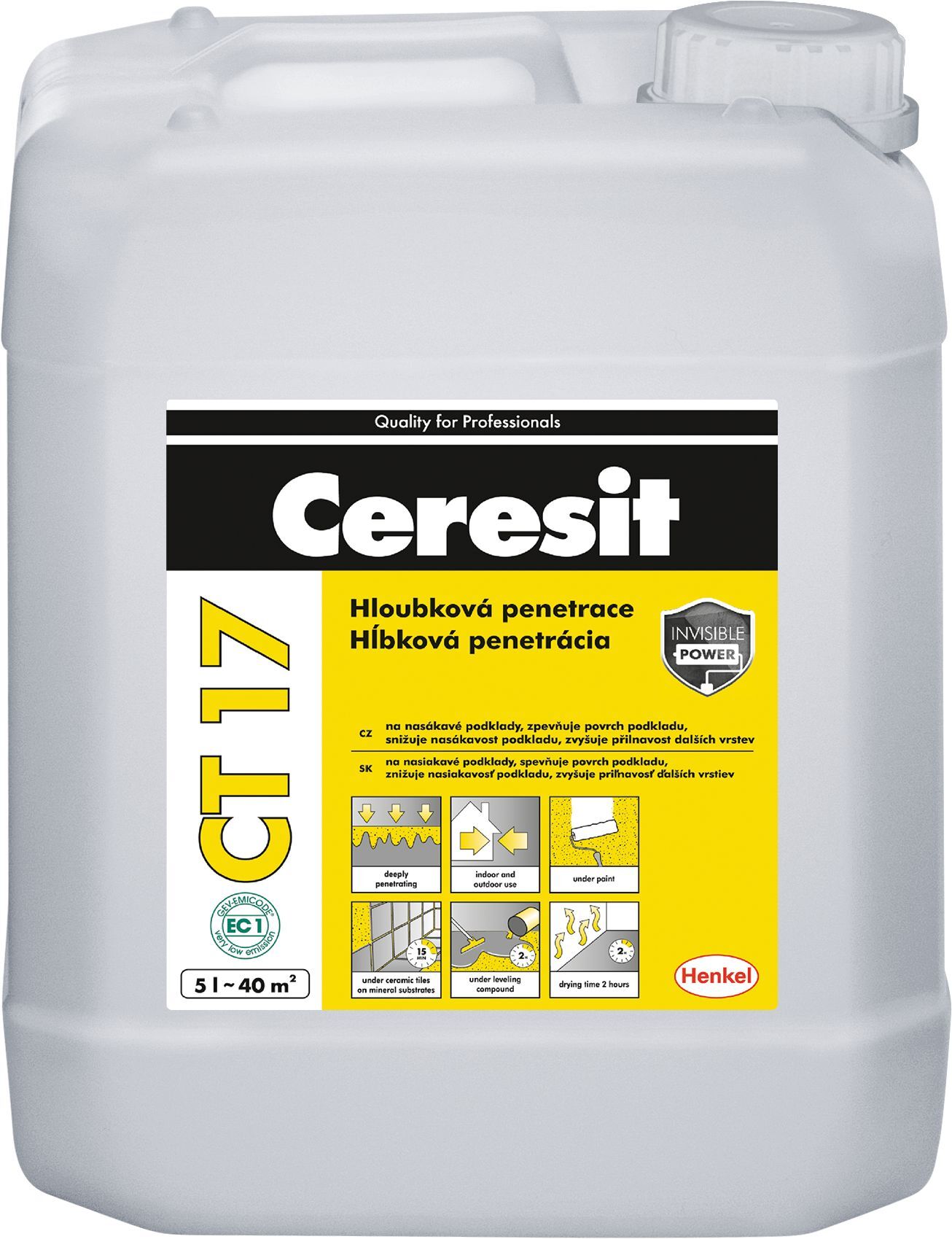 Základný náter na ošetrenie nasiakavých podkladov pred lepením obkladových materiálov, nanesením povrchových vrstiev a vyrovnávacích hmôt. Penetračný náter CT 17 účinkuje hĺbkovo na hornej hrane danej konštrukcie, zvyšuje jej pevnosť a znižuje nasiakavosť. Na penetračné nátery podkladov v interiéri aj exteriéri pred lepením keramických obkladov a dlažieb, vyrovnávaním podláh, stierkovaním, maľovaním, natieraním a lepením izolačných dosiek. – pre interiér a exteriér – spevňuje povrchy – znižuje nasiakavosť – zvyšuje priľnavosť – neobsahuje rozpúšťadlá – paropriepustný Pre použitie na všetky nasiakavé podklady ako omietky, betóny, potery, sadrové, anhydritové a pórobetónové podklady, drevotriesky a sadrokartón.