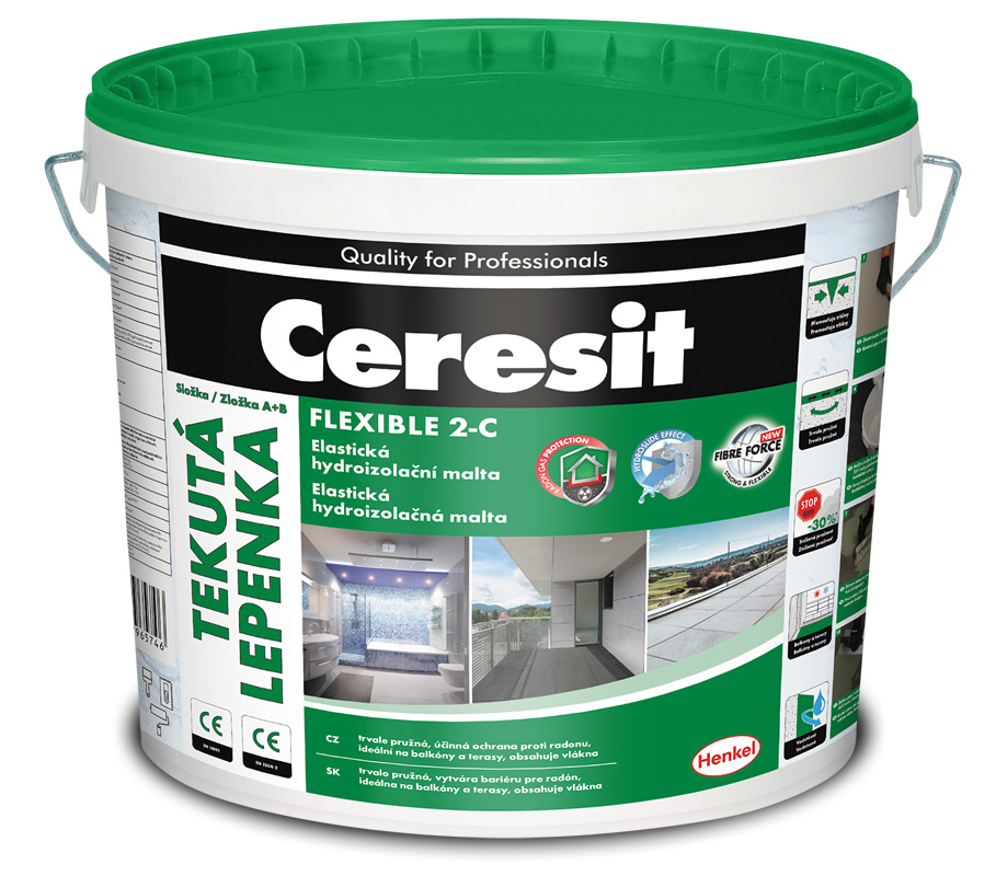 Dvojzložková hydroizolačná malta na izolovanie stavieb a stavebných dielcov proti pôsobeniu vody a radónu.Vlastnosti Tekutej lepenky Ceresit Flexible 2-C trvalo pružná aplikácia bez penetrácie aplikačná teplota až do +30°C obsahuje výstužné vlákna, nie je potrebná dodatočná výstuž UV odolná, ideálna pod podlahové krytiny na rošte (drevné palubky, keramické prvky položené na terčoch) Ceresit TEKUTÁ LEPENKA je dvojzložková, trvalo pružná hydroizolačná stierka vystužená špeciálnou kombináciou vlákien. Je vhodná na hydroizolvanie pivníc, zákadov a betónových prvkov. Vďaka UV odolnosti je ideálna na vytvorenie účinnej hydroizolácie na balkóny, terasy s nášlapnou vrstvou položenou na rošte (napr drevené, palubové dosky), alebo s keramickými doskami uloženými na dištančných terčoch. Pri správnej aplikácii vytvorí Ceresit TEKUTÁ LEPENKA účinnú ochranu proti prieniku radónu. Po vytvrdnutí je možné na Ceresit TEKUTÚ LEPENKU priamo nanášať cementové lepidlá alebo potery. Ceresit TEKUTÁ LEPENKA nie je vhodná ako konečná vrstva, neodoláva mechanickému zaťaženiu. Na sadrové podklady odporúčame použiť iný typ hydroizolácie. Má veľmi nízky obsah emisií, EC 1 PLUS.Príprava podkladu:Ceresit TEKUTÚ LEPENKU používajte na podklady nosné, pevné, rovné, nasiakavé, pórovité a čisté, bez vrstiev znižujúcich priľnavosť (ako napr. tuky, živice a prach). Podkladom môžu byť: betón (vek min. 28 dní) cementové potery a omietky (vek min. 28 dní) rýchlo tvrdnúci poter Ceresit CN 87 (vek min. 3 dni) murivo z tehál, tvárnic a blokov, plne vyškárované (vek min. 28 dní). Znečistenie, vrstvy s nedostatočnou priľnavosťou, všetky nátery, maľby a nesúdržné častice mechanicky odstráňte. Odporúčame očistenie podkladu opieskovaním alebo vysokotlakovým umytím vodou. Praskliny menšie ako 1,0 mm rozšírte a vyplňte cementom Ceresit CX 5. Nerovnosti a nepravidelné podklady vyrovnajte cementovou maltou. Ostré presahy a hrany odseknite alebo obrúste. Nárožia zrazte na cca 3 cm, rohy a kúty vyplňte cementovou maltou (alebo cementom Ceresit CX 5 zmiešaným s pieskom) a zaoblite do polomeru cca 4 cm, pre pravidelný prechod. Pred nanesením Ceresit TEKUTEJ LEPENKY podklad navlhčite tak, aby sa netvorili mláky. Pred aplikáciou na súdržný, minerálny nasiakavý podklad, nie je potrebný penetračný náter.Aplikačný postup Ceresit Tekutá lepenka:Príprava Ceresit TEKUTEJ LEPENKY závisí od zamýšľaného spôsobu spracovania: Pre nanášanie striekaním, alebo valčekom – zložku B (emulzia) nalejte do miešacej nádoby, prilejte 0,9 litra vody a za stáleho miešania nízkootáčkovým miešadlom prisypte zložku A (prášok). Pre nanášanie hladidlom – zložku B (emulzia) nalejte do miešacej nádoby a za stáleho miešania nízkootáčko- vým miešadlom prisypte zložku A (prášok). Zmes miešajte, kým nezískate jednoliatu hmotu bez hrudiek. Počkajte cca 5 minút a opäť krátko premiešajte. Pri ručnom nanášaní, naneste prvú vrstvu Ceresit TEKUTEJ LEPENKY vždy štetkou alebo štetcom do vlhkého, ale nie mokrého podkladu. Nanesenú vrstvu chráňte pred príliš rýchlym vyschnutím. Druhú vrstvu (v prípade nanášania štetcom) naneste krížom v okamihu, kedy prvá vrstva zatvrdne (odporúčame, aby bola ešte vlhká). Ak je potrebná tretia vrstva, postupujte rovnakým spôsobom. V bežných podmienkach je možné nanášať ďalšie vrstvy už po cca 90 – 120 minútach. Minimálna hrúbka izolácie po zaschnutí: 2 mm. V miestach dilatačných škár, „pracujúcich“ prasklín a tam, kde zaoblenie rohov o polomere cca 4 cm je ťažko uskutočniteľné – odporúčame medzi vrstvy Ceresit TEKUTEJ LEPENKY zapracovať izolačný pás Ceresit CL 152 (Ceresit CL 82). Po 12 hodinách od nanesenia, je Ceresit TEKUTÁ LEPENKA pochôdzna, napriek tomu ani po úplnom zatvrdnutí nie je malta odolná proti intenzívnemu mechanické mu zaťaženiu. Nanesenú hydroizolačnú vrstvu chráňte minimálne 3 dni pred príliš rýchlym vyschnutím, mrazom a atmosférickými zrážkami. Odporúčame použitie ochranných sietí ako ochranu pred priamym slnečným žiarením, prievanom, dažďom alebo mrazom. Neodporúčame ošetrovať maltu polievaním alebo vodným postrekom. Keramické obklady a dlažby je možné lepiť po 12 hodinách od aplikácie Ceresit TEKUTEJ LEPENKY, kedy je malta už pochôdzna, maliarske nátery nanášajte najskôr po 3 dňoch. Ceresit TEKUTÁ LEPENKA nemôže byť vystavená intenzívnemu mechanickému namáhaniu.Technické informácie Ceresit Tekutá lepenka: Pomer miešania 14kg (valček/striekanie): 10,5kg zložky A + 3,5L zložky B + 0,9L vody Pomer miešania 7kg (valček/striekanie): 5,25kg zložky A + 1,75L zložky B + 0,45L vody Pomer miešania 14kg (hladítko): 10,5kg zložky A + 3,5L zložky B Pomer miešania 7kg (hladítko): 5,25kg zložky A + 1,75L zložky B Teplota spracovania: od +5 °C do +30 °C Doba spracovania: do 60 min. Pokládka dlažby /obkladu: najskôr po 12 hod. Orientačná spotreba: 3,5 kg / 1 m² / 2 mm Koef. difúzie radónu D: 1,710(-11) +- 0,2(-11) m²/s