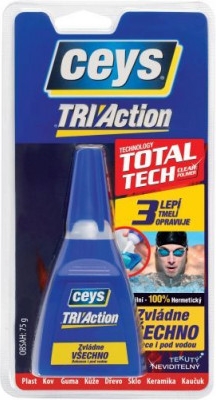 Ceys Tri Action tekutý lep s technológiou Total Tech -lepí tmelí, opravuje akýkoľvek materiál v akejkoľvek situácii, je odolný aj najtvrdším pomienkam. Je extrémne odolný , pružný a 100% hermetický. Jeho tekutá štruktúra umožňuje lepenie veľkých plôch rýchlo, čisto a bez nutnosti silnej vrstvy lepidla.