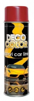 Rýchloschnúca akrylová farba, používa sa pri malých náterových opravách a pri údržbe. Vhodná najmä pri striekaní strojov a ich častí, zariadení, hliníkových konštrukcií, náradia, vozidiel, železného nábytku apod. Použite sa vzťahuje aj na povrchy z dreva, keramiky, skla, prútia, lepenky a na niektoré plasty.  Poznámka. Pre povrchy z PUR, PS, PA, EPDM, ABS, GfK, pre tvrdené PVC treba použiť Plastic Primer DECO COLOR ako základ. Najlepší výsledok aplikovania farby je pri 15-25°C.   Vlastnosti Deco Color Acryl Car line: Rýchlejší čas schnutia: 5 minút Suchý na dotyk: 15-20 min Stvrdnutie: po 16-20 hodinách Výdatnosť 2-2,5 m² v závislosti na farbe a typu povrchu v jednej vrstve Veľmi dobrá krycia schopnosť Vysoký lesk Vytvára tvrdý povlak odolný proti poškriabaniu a nárazom Antikorózne vlastnosti Odolnosť voči benzínu a nafte 5 základných farieb v systéme RAL Pre vnútorné a vonkajšie použitie Veľkosť balenia 500/150 ml Návod na použitie Deco Color Acryl Car line:Produkt nanášajte pri teplote cca 15-25°C (optimálna teplota pre dobré zaschnutie laku). Doba schnutia závisí aj od vlhkosti vzduchu a hustoty produktu. Maľovanie by sa malo vykonávať v dobre vetranej miestnosti. Pred začatím natierania nádobou pretrepávajte asi jednu minútu, čo pomôže premiešať lak oceľovou guľôčkou vo vnútri. Vykonajte skúšobný nástrek. Lak nanášajte v niekoľkých tenkých vrstvách namiesto jednej hrubej vrstvy zo vzdialenosti 25-30 centimetrov. Pri aplikácii počkajte niekoľko minút medzi jednotlivými vrstvami. Po dokončení vyčistite trysku. Nádobu postavte dnom nahor a stlačte trysku po dobu troch sekúnd.