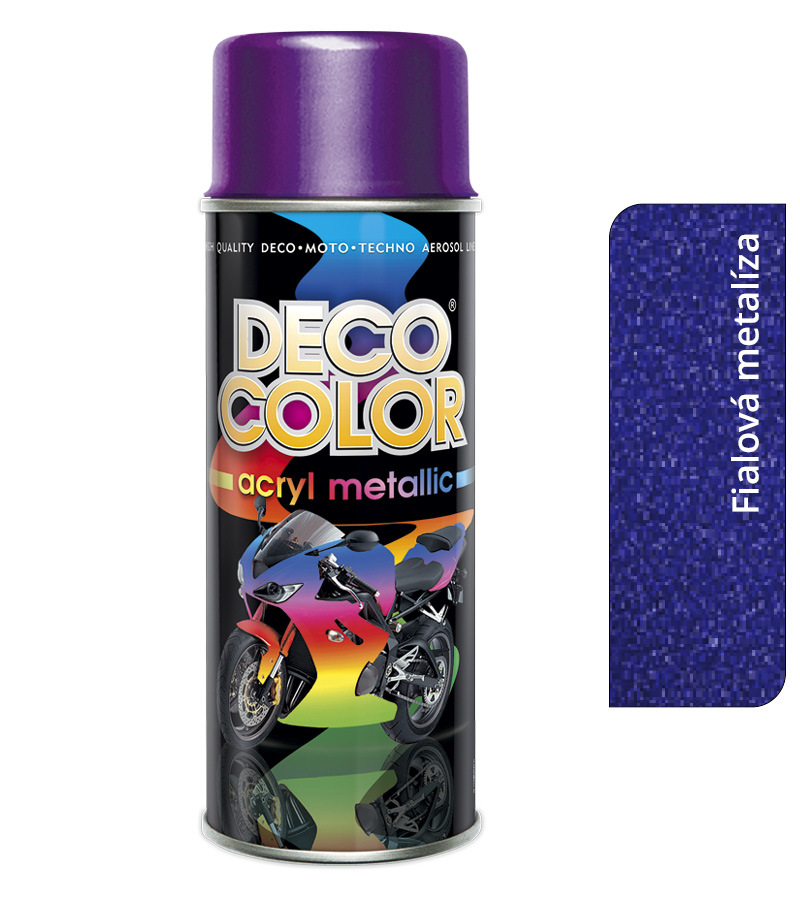 Akrylová farba s jedinečným metalickým efektom. Používa sa tuningovými fanúšikmi pre úpravu automobilov, motocyklov, bicyklov, modelov áut a lietadiel, kovových stojanov, kufrov na náradie. Pre povrchy ako je kov, kameň, drevo, a niektoré plasty.  Poznámka. Pre povrchy z PUR, PS, PA, EPDM, ABS, GfK, pre tvrdené PVC treba použiť Plastic Primer DECO COLOR ako základ. Najlepší výsledok aplikovania farby je pri 15-25°C. Pre dodatočnú ochranu by sa mal použiť lak z rady Acryl car DECO COLOR. Poznámka. Lak aplikujte pred vyschnutím farby.   Vlastnosti Deco Color Acryl Metallic: Metalický efekt (metalíza) Veľmi dobrá krycia schopnosť Krátka doba schnutia: 10-15 min Suchý na dotyk: 30-40 min Stvrdnutie: po 24 hodinách Výdatnosť 1,5-2 m² v závislosti na farbe a typu povrchu v jednej vrstve Odolnosť voči oderu a poveternostným vplyvom Odolnosť voči benzínu a nafte Pre vnútorné a vonkajšie použitie V ponuke 7 najbežnejších farieb Veľkosť balenia 400 ml Návod na použitie Deco Color Acryl Metallic:Produkt nanášajte pri teplote cca 15-25°C (optimálna teplota pre dobré zaschnutie laku). Doba schnutia závisí aj od vlhkosti vzduchu a hustoty produktu. Maľovanie by sa malo vykonávať v dobre vetranej miestnosti. Pred začatím natierania nádobou pretrepávajte asi jednu minútu, čo pomôže premiešať lak oceľovou guľôčkou vo vnútri. Vykonajte skúšobný nástrek. Lak nanášajte v niekoľkých tenkých vrstvách namiesto jednej hrubej vrstvy zo vzdialenosti 25-30 centimetrov. Pri aplikácii počkajte niekoľko minút medzi jednotlivými vrstvami. Po dokončení vyčistite trysku. Nádobu postavte dnom nahor a stlačte trysku po dobu troch sekúnd.