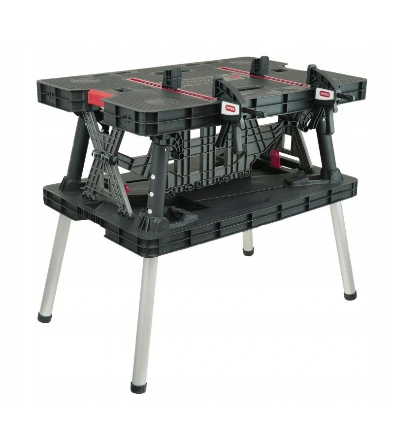 Univerzálny a praktický skladací stôl Work Table sa osvedčí v rôznych pracovných podmienkach a jeho funkčnosť ocenia profesionáli aj amatéri. Jedinečný dizajn stola umožňuje rýchle a ľahké skladanie a rozkladanie a veľký pracovný priestor na ňom umožňuje vykonávať rôzne práce.Stôl vydrží zaťaženie až 453 kg. Maximálny rozmer stolovej dosky po rozložení je 550 mm x 850 mm (zložená výška – 110 mm, rozložená – 755 mm, pracovná dĺžka svorky – 300 mm, výška svorky – 65 mm). Stôl je dodávaný s dvoma 30 cm / 12 ”svorkami, ktoré dodatočne zvyšujú stabilitu pracovnej dosky a bezpečnosť práce. Veľkou výhodou stola je jeho prenosná konštrukcia a niekoľkosekundové zloženie, vďaka čomu ho možno použiť na rôzne práce, na rôznych miestach.