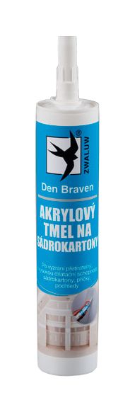 Den Braven akrylový tmel na sadrokartóny biely predstavuje jednozložkový škárovací tmel na báze špeciálnych akrylov. Vytvrdzuje vulkanizáciou vzdušnej vlhkosti a vytvára trvalo pevný a elastický spoj. Tmelí škáry v interiéroch, medzi drevenými, kovovými a plastovými rámami okien, medzi murivom, drevom, betónom, kovmi, sklom, plastmi v priemysle aj stavebníctve.