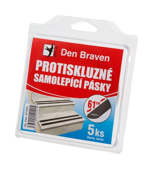 Den Braven protišmyková samolepiaca páska je balená v ekonomickom balení, má vysokú lepivosť ku kameňu, drevu, mremoru pre interiér aj exteriér. Zabraňuje pošmyknutiu na hladkých schodoch, taktiež pri námraze alebo po daždi. Konce pásky sú ukončené zaoblením. Je vhodná pri maľovaní či sťahovaní, použiteľná na hladké povrchy aj koberce. Páska má zrnitý povrch odolný proti oderu.