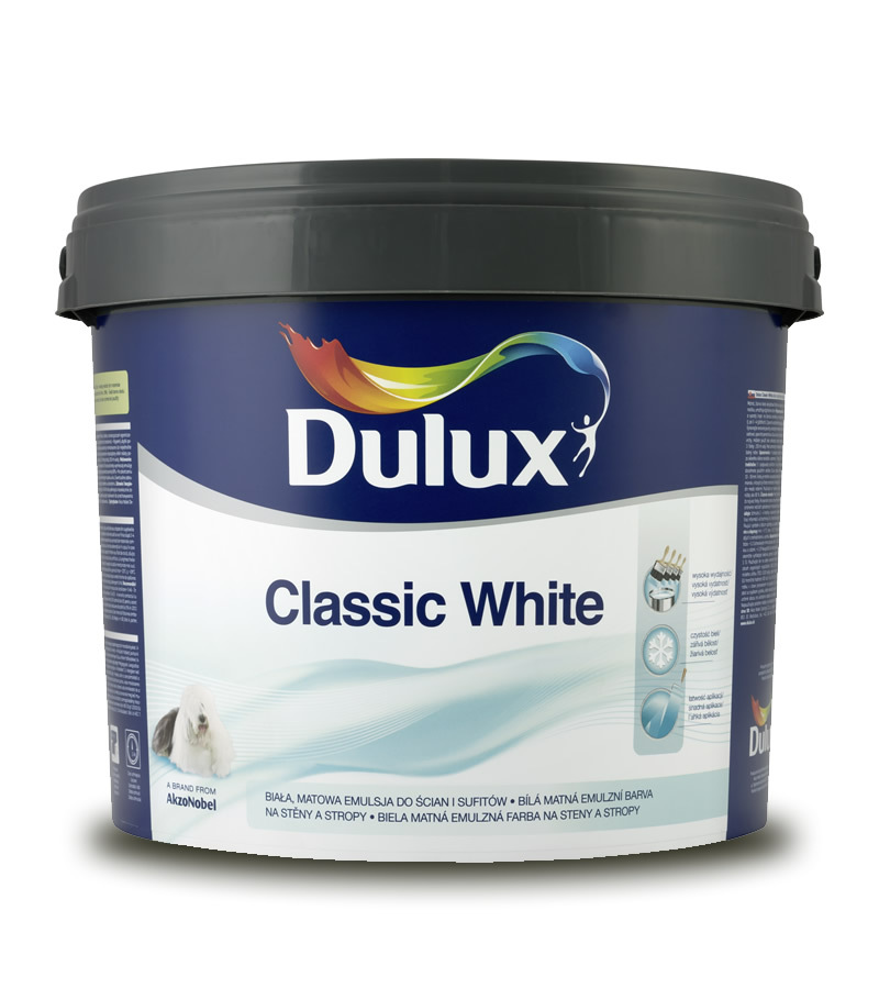 Dulux Classic White je matná, žiarivo biela, akrylátová emulzná farba určená k dekoratívnym a ochranným náterom stien a stropov v interiéri. Zaručuje veľmi dobré krytie a dlhú životnosť odtieňa. Mikroporézna štruktúra náteru umožňuje dýchanie stien.Vlastnosti: Výsledný vzhľad: matný Určenie: Pre vnútorné použitie. Odolnosť proti pôsobeniu vody: Odolný proti štandardnej vlhkosti v miestnostiach. Natretý povrch nesmie byť v stálom kontakte s vodou a nesmie byť dlhodobo vystavený kondenzovanej vlhkosti. Odolnosť proti pôsobeniu tepla: Farba nie je vhodná na natieranie vyhrievaných plôch, napr. Kúrenia. Ostatné: Je ľahko roztierateľná a pri nízkej spotrebe umožňuje zachovanie dobrého krytia. Tixotropná štruktúra spôsobuje, že pri natieraní farba neodkvapkáva, čo je veľmi praktické v prípadoch, keď napr. nie je možné premiestniť alebo dostatočne zakryť nábytok. Farba je paropriepustná, čo umožňuje stenám dýchať.Teoretická vydatnosť:Až 14m2/l v jednej vrstve na hladkom, rovnom a vhodne pripravenom povrchu