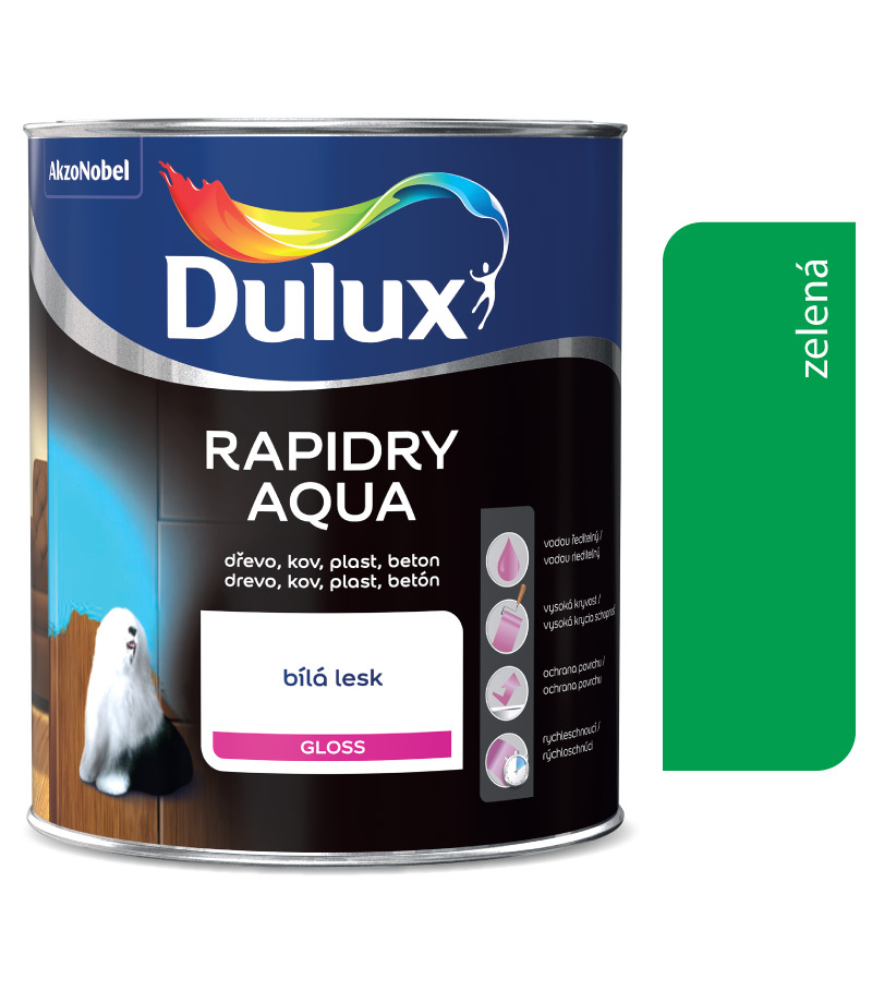 Dulux Rapidry Aqua je kvalitný, vodouriediteľný univerzálny náter vysokej kvality určený na drevené, kovové a plastové povrchy. Môže sa používať aj na nepochôdzne betónové povrchy. Používa sa v interiéri aj v exteriéri. Farba je rýchloschnúca s minimálnym zápachom. Vynikajúco sa rozlieva a výborne kryje. Dlhodobo odoláva teplotám do 80°C, je možné použitie na náter vykurovacích telies. vodouriediteľná univerzálna farba na kov, drevo, plast a betón vysoká krycia schopnosť ochrana povrchu využitie v interiéri aj exteriéri minimálny zápach rýchloschnúci dlhodobo odoláva teplotám do 80°C nanášanie valčekom, štetcom alebo striekaním náter suchý na dotyk po 30 minútach výdatnosť max. 14m2/lÚprava povrchu: Natieraný povrch musí byť obrúsený, pevný, čistý, suchý, odmastený, zbrúsený a zbavený prachu či ďalších nečistôt. Vyrovnajte nerovné povrchy vhodným tmelom. Pri zmiešaných či holých, skôr nenatretých povrchoch použite vhodnú základovú farbu – Dulux WB Trim Primer – potom dosiahnete adekvátnu ochranu proti korózii. Pre drevené povrchy vystavené vonkajším klimatickým podmienkam, použite vhodnú impregnáciu. Aplikácia: pred použitím obsah dôkladne premiešajte, nerieďte. Nanášajte štetcom, valčekom alebo striekaním. Nanášajte 2 až 3 vrstvy s odstupom 4 až 6 hodín medzi jednotlivými nátermi. Náter je suchý na dotyk po 30-tich minútach. Ideálne použitie je pri teplote vyššej ako +10°C a relatívnej vlhkosti nižšej ako 80%.Po skončení práce umyte použité nástroje vodou. Pred čistením odstráňte zo štetca a valčeka čo najviac farby.