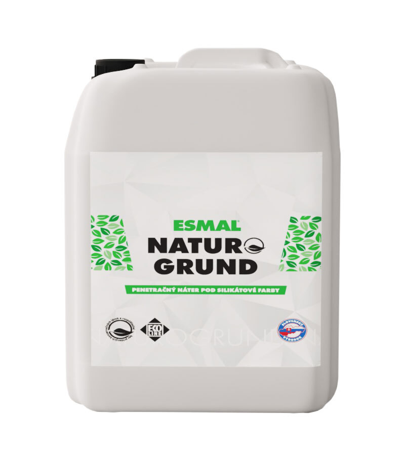 Tekutý silikátový penetračný náter určený na spevnenie minerálnych podkladov. Používa sa na prípravu pred maľovaním, príp.iným stavebným úkonom, kde sa vyžaduje jednotná nasiakavosť, súdržnosť a čistota podkladu. Vysoký obsah silikátového spojiva zabezpečuje dokonalú prípravu podkladu pred aplikovaním silikátového náteru, napr. ESMAL NATURO. Vyznačuje sa jednoduchou aplikáciou, reguláciou nasiakavosti podkladu, vysokou pevnosťou a paropriepustnosťou a zdravotnou nezávadnosťou.Vlastnosti: Výdatnosť: cca 10m2 z 1l (nariedeného penetračného náteru) Riedenie: zvyčajne v pomere 1:4 (napr. 1l ESMAL NATURO GRUND a 4l vody). Obsah sušiny: min. 20% (v neriedenom stave) pH: 9,0 – 10,5 Farba: bezfarebná Doba schnutia: vhodná na ďalšiu aplikáciu po 12 hod.Spôsob nanášania:Pred použitím hmotu pretrepte. Pripravený náter nanášajte na suchý a čistý podklad štetcom alebo valcom určeným na penetrovanie (napr. ESMAL PROFI GRUND) zvyčajne v jednej vrstve. Pri veľmi nasiakavom podklade je potrebné penetrovať dva razy za sebou (tzv. „mokré do mokrého“). Pred aplikáciou je potrebné ochrániť okolie natieraných plôch, zvlášť sklo, prírodné materiály (drevo, kameň), všetky lakované podklady a pod.Úprava podkladu:Podklad pred penetrovaním musí byť suchý, čistý, dokonale vyzretý a zbavený mastnosty a biologických nečistôt (machy, riasy, plesne)