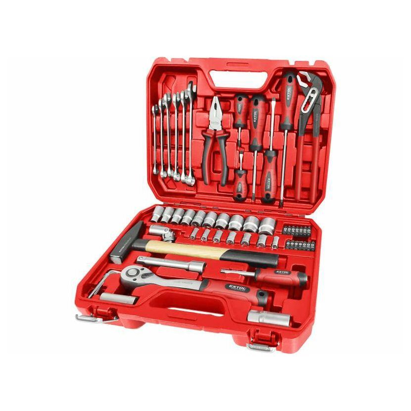 Extol Premium Sada náradia, 56-dielna, 1/2″ a 1/4″, skrutkovače, kliešte, kľúče, kladivo