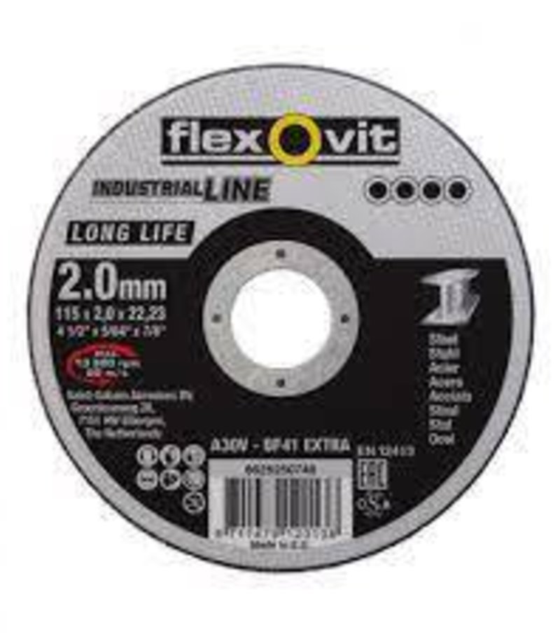 Profesionálne kotúče najvyššej kategórie radu Flexovit – Mega Line s predĺženou životnosťou. Použitie na oceľ pre uhlové brúsky. Neobsahuje železo, síru a chlór. Rôzne hrúbky, silné kotúče pre precízne a priame rezanie. Prispôsobené iba na rezanie !!! Redukuje spotrebu energie. Nízky hluk, menej iskier, minimálne vibrácie.