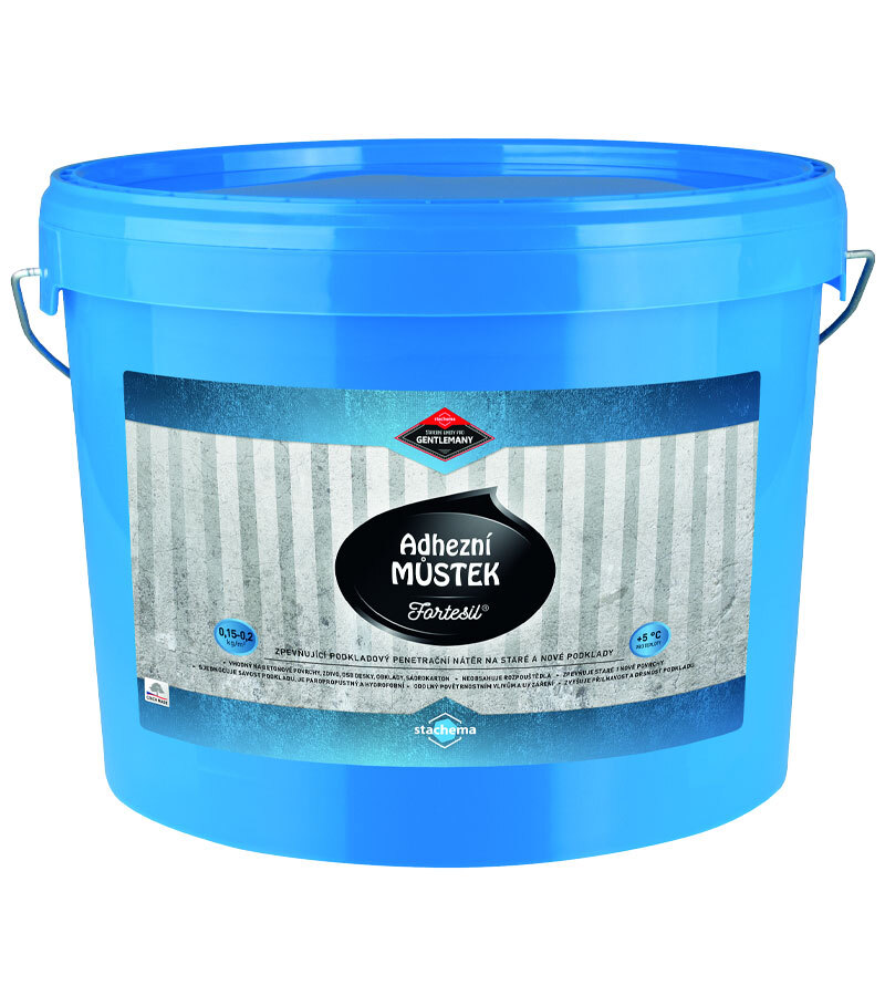 Fortesil adhézny mostík je jednozložkový bezrozpúšťadlový náter, ktorý je možné použiť v interiéroch aj exteriéroch na vyzreté omietky, betón, sklenené tapety, drevené, papierové alebo sadrokartónové povrchy, na drevotriesku, OSB dosky, umakart, obklady, dlažby atď. Ide o spevňujúci podkladový náter určený ako prvý náter všetkých savých aj nesavých stavebných materiálov, ktoré sú následne upravované stierkami, akrylátovými farbami, akrylátovými omietkovinami atď. Dá sa použiť aj samostatne pre spevnenie povrchu a zvýšenie jeho hydrofobity. Spotreba: 0,15-0,2kg/m2 podľa savosti podkladu