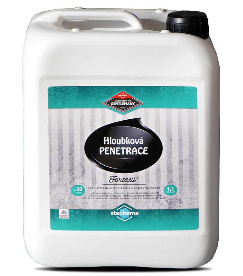 Hĺboková koncentrovaná penetrácia s riedením 1:3 až 1:5 na 450-750m2.HĹBKOVÁ AKRYLÁTOVÁ PENETRÁCIA na spevnenie savých podkladov ako sú omietka, sadrokartón, betón a pod. Penetračný prostriedok je určený na hĺbkové spevnenie podkladu, potlačuje vzlínanie rozpustných solí podkladu, zjednocuje savosť, spája nekompaktné časti podkladu, spevňuje podklad a zvyšuje priľnavosť k vrchnému náteru. Vhodný na aplikáciu v interiéri aj v exteriéri. Výdatnosť:1:3 75-100m2/l1:5 90-150m2/lAplikácia: Penetračný prostriedok sa aplikuje na porézne podklady ako sú betón, vápenné, vápenno cementové, cementové a disperzné omietky, sadrokartón. Pred penetráciou musí byť povrch dokonale očistený od prachu a rôznych nečistôt, suchý a vyzretý.Penetračný prostriedok sa riedi vodou v pomere 1:3 (veľmi savé podklady) až 1:5 podľa savosti podkladu. Aplikuje sa pri teplote od 5°C do 25°C bez priameho slnečného pôsobenia. Povrch má byť penetračným prostriedkom nasýtený, ale na povrchu nesmie zostať vrstva nevstrebaného prostriedku. Aplikuje sa štetkou alebo valčekom.Pracovné prostriedky sa ihneď po ukončení práce umyjú vodou. Likvidácia odpadu a obalu: Likvidujte v súlade so zákonom o odpadoch ako nie nebezpečný odpad. Prázdny obal odovzdajte v zbernom mieste.