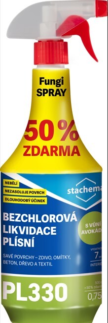 Likvidácia plesne bezchlórovým prípravkom Fungispray s fungicídnym účinkom. Prostriedok určený na ochranu proti plesniam, najmä v domácnostiach-pleseň v kúpeľni, pleseň v byte, pleseň v dome, pleseň na stene, zdravotníctvo, potravinárstvo, veterinárnych zariadeniach a poľnohospodárstvo na poréznych stavebných materiáloch ako sú múry, omietky, betón, drevo, strechy z eternitu pod. Fungispray bezchlórový nemá bieliace účinky a pôsobí preventívne v závislosti na expozícii ošetreného miesta.Prvým krokom dezinfekčného postupu by vždy malo byť usmrtenie plesní, v niektorých prípadoch spojené s ich mechanickým odstránením. Dezinfekcia miest napadnutých plesňami sa vykonáva za mokra. Pri dezinfekcii sa uplatňujú štyri základné aplikačné postupy: postrek, namočení, utretie a ponorenie (iba pri predmetoch). Podľa miesta výskytu a veľkosti kontaminácie sa odporúča kombinácia uvedených spôsobov. Po použití dezinfekčných prípravkov a dobe pôsobenia (cca 60 minút) nasleduje mechanická očista napadnutého miesta (odstránenie plesne na stene), ktorá sa vykonáva vždy a jedine za mokra. Nesmie totiž dochádzať na rozprašovanie a vdychovanie častíc plesní. Mechanické odstraňovanie je nutné robiť do maximálnej hĺbky. Pri rozsiahlejších sanáciou je nutné vykonať kontrolu účinku dezinfekcie (mykologickej a bakteriologický rozbor plôch a povrchov).Vlastnosti:- Objem: 750 ml