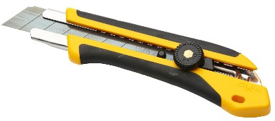 Profesionálny orezávací nôž s nerezovým vedením čepele, protišmykovou rukoväťou a kovovou platňou na konci rukoväte na otváranie plechoviek. Odolný voči acetónu, s aretačnou skrutkou pre plynulý posuv čepele, šírka čepele 25 mm. Brity sú vymeniteľné.
