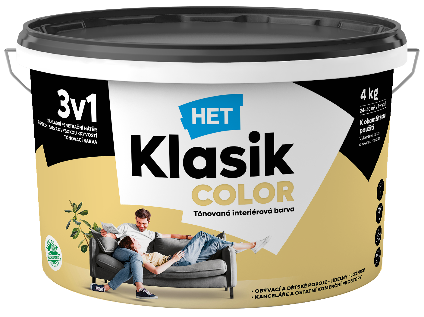 Kvalitná tónovaná disperzná interiérová oteruvzdorná farba. Farba je vhodná pre obývacie a komerčné priestory, detské izby, jedálne, chodby, kancelárie, predajné priestory.Vlastnosti Het Klasik Color: moderné pastelové odtiene okamžitá aplikácia tónovanej farby perfektná spracovateľnosť výborná krycia schopnosť a roztierateľnosť matný vzhľad odolnosť proti oteru za sucha vynikajúca paropriepustnosť vhodná aj na sanačné omietky ODPORÚČANÉ POUŽITIE: Het Klasik Color je vhodná na nátery stien a stropov, vápenných, vápenno-cementových, sadrovápenných a sadrových omietok, sadrokartónových, sadrovláknitých a drevovláknitých dosiek, omietok s akrylátovým spojivom, sanačných omietok (spĺňa požiadavku smernice WTA CZ limitujúcu použitie krycích vrstiev na sanačných omietkach z hľadiska priepustnosti pre vodné pary), betónových panelov a monolitov, papierových tapiet na to určených, tapiet zo sklených vlákien a pod. Takisto na aplikáciu na podklady s kombináciou napr. minerálnych omietok a sadrokartónu.Výdatnosť: 6-10m2/kg v jednej vrstve podľa nasiakavosti a štruktúry podkladu a hrúbky nanesenej vrstvy. Riedenie: napúšťací náter max 0,3l/kg, finálny náter max 0,1l/kgNanášanie: valčekom štetkou airless HVLP