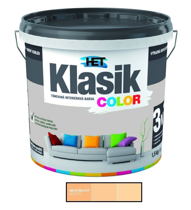 Kvalitná tónovaná disperzná interiérová oteruvzdorná farba. Farba je vhodná pre obývacie a komerčné priestory, detské izby, jedálne, chodby, kancelárie, predajné priestory.Vlastnosti Het Klasik Color: moderné pastelové odtiene okamžitá aplikácia tónovanej farby perfektná spracovateľnosť výborná krycia schopnosť a roztierateľnosť matný vzhľad odolnosť proti oteru za sucha vynikajúca paropriepustnosť vhodná aj na sanačné omietky ODPORÚČANÉ POUŽITIE: Het Klasik Color je vhodná na nátery stien a stropov, vápenných, vápenno-cementových, sadrovápenných a sadrových omietok, sadrokartónových, sadrovláknitých a drevovláknitých dosiek, omietok s akrylátovým spojivom, sanačných omietok (spĺňa požiadavku smernice WTA CZ limitujúcu použitie krycích vrstiev na sanačných omietkach z hľadiska priepustnosti pre vodné pary), betónových panelov a monolitov, papierových tapiet na to určených, tapiet zo sklených vlákien a pod. Takisto na aplikáciu na podklady s kombináciou napr. minerálnych omietok a sadrokartónu.Výdatnosť: 6-10m2/kg v jednej vrstve podľa nasiakavosti a štruktúry podkladu a hrúbky nanesenej vrstvy. Riedenie: napúšťací náter max 0,3l/kg, finálny náter max 0,1l/kgNanášanie: valčekom štetkou airless HVLP