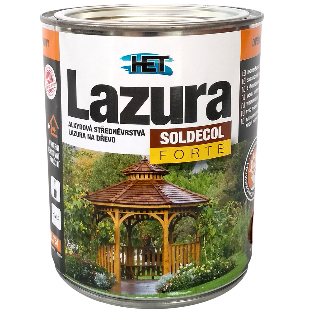 Rozpúšťadlová alkydová lazúra PROFESIONÁLNEJ kvality pre ochranné a dekoratívne nátery drevených povrchov. Lazúra je ošetrená účinnými fungicídnymi a algicídnymi prípravkami a jej náterový film tak lepšie odoláva hubám a riasam. Kvalitné stálofarebné pigmenty spolu so silikonizovanou alkydovou živicou a zmesou veľmi kvalitných voskov prirodzene zvýrazňujú štruktúru a kresbu dreva. Vytvára pololesklý a vysoko vodoodpudivý povrch, ktorý vykazuje veľmi dobrú odolnosť poveternostným vplyvom a UV žiareniu. Celkovú mechanickú odolnosť náterového filmu zvyšuje použitie aditíva proti poškriabaniu náteru. Vďaka svojim vlastnostiam lazúra veľmi dobre penetruje, perfektne sa rozotiera a má výborný rozliv.Lazúra je vhodná na nové a obnovovacie nátery drevených stavebných dielov alebo konštrukcií napr. v interiéri na nátery krovov, podhľadov, dverí, stoličiek, stolov a pod., v exteriéri napr. na nátery záhradného nábytku, plotov, paluboviek, pergol, chát, chalúp .OdtieňBezfarebný + 60 odtieňov podľa vzorkovnice SOLDECOL LAZURA FORTE tónovaných na tónovacích strojoch. Odtiene je možné vzájomne medzi sebou miešať. Bezfarebný transparentný odtieň je možné použiť na zosvetlenie tmavších odtieňov, prípadne ako obnovovací náter pri požiadavke na zachovanie pôvodného odtieňa.