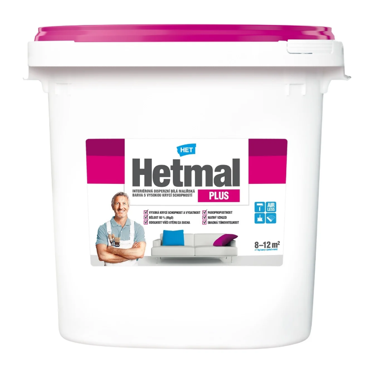 Klasický tekutý maliarsky náter, biela farba na stenu k vnútorným náterom stien a stropov vápenných, vápennocementových omietok, muriva, betónových panelov a pod.). Výrobok spĺňa požiadavky pre nátery povrchov, ktoré môžu prichádzať do nepriameho a priameho náhodného styku s potravinami. Náter vytvára vysoko kryvý, matný, paropriepustný povrch, ktorý je odolný voči štandardnej vlhkosti v miestnostiach. Natretý povrch nesmie byť v stálom kontaktu s vodou a nesmie byť vystavený kondenzujúcej vlhkosti. Zaschnutý náter krátkodobo odolá teplote okolo 70 ° C. Farba je vhodná pre výmaľbu obytných, úžitkových a priemyselných priestorov s nižšími nárokmi.Prednosti maliarskej farby Hetmal Standard : belosť 91% (MgO) výborná krycia schopnosť ľahká tónovateľnosť matný vzhľad paropriepustnosť výhodná cena Biely, tónovanie je možné vykonávať tónovacími farbami HETCOLOR alebo tónovacími prípravkami Kolorka FORTE (max. do pomeru 1:10 dielom farby)Výdatnosť:6 - 10 m² z 1 kg farby v jednej vrstve podľa nasiakavosti a štruktúry podkladu, aplikačnej techniky, hrúbky nanesenej vrstvy a ďalších faktorov.