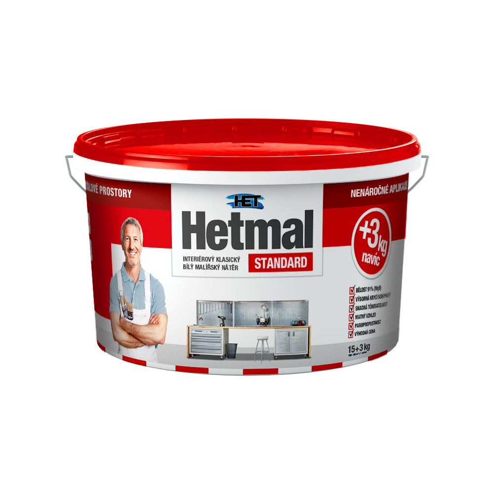 Klasický tekutý maliarsky náter, biela farba na stenu k vnútorným náterom stien a stropov vápenných, vápennocementových omietok, muriva, betónových panelov a pod.). Výrobok spĺňa požiadavky pre nátery povrchov, ktoré môžu prichádzať do nepriameho a priameho náhodného styku s potravinami. Náter vytvára vysoko kryvý, matný, paropriepustný povrch, ktorý je odolný voči štandardnej vlhkosti v miestnostiach. Natretý povrch nesmie byť v stálom kontaktu s vodou a nesmie byť vystavený kondenzujúcej vlhkosti. Zaschnutý náter krátkodobo odolá teplote okolo 70 ° C. Farba je vhodná pre výmaľbu obytných, úžitkových a priemyselných priestorov s nižšími nárokmi.Prednosti maliarskej farby Hetmal Standard : belosť 91% (MgO) výborná krycia schopnosť ľahká tónovateľnosť matný vzhľad paropriepustnosť výhodná cena Biely, tónovanie je možné vykonávať tónovacími farbami HETCOLOR alebo tónovacími prípravkami Kolorka FORTE (max. do pomeru 1:10 dielom farby)Výdatnosť:6 – 10 m² z 1 kg farby v jednej vrstve podľa nasiakavosti a štruktúry podkladu, aplikačnej techniky, hrúbky nanesenej vrstvy a ďalších faktorov.