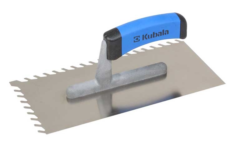 Hladítko nerezové 130 x 270 mm šikmý zub 8 G-1 0487 Oceľ nerezová, kyseline odolná, hrúbka: 0,7mm, dvojzložková rukoväť (G-1), na podlahy, nanášanie omietok, lepidiel a štukov, brúsená, leštená, na štukatérske práce.