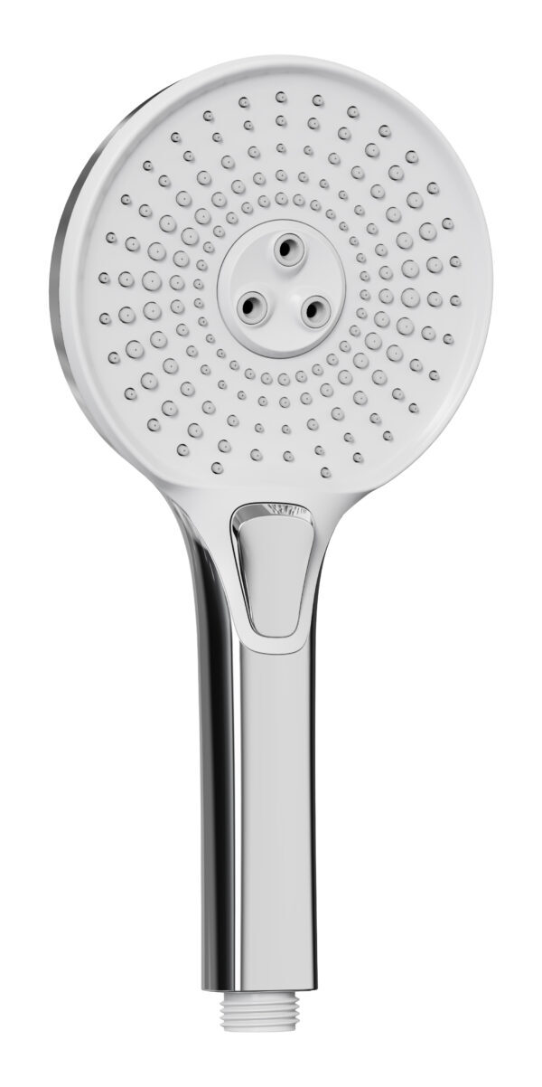 Ručná sprcha s tlačidlom proti vodnému kameňu. 3 funkcie. Priemer 120 mm.Moderný všestranný dizajn – dokonale sa hodí k chrómovým aj čiernym batériám a doplnkom.Zväčšený priemer s väčším počtom trysiek pre skvelý zážitok zo sprchovania.Tri funkcie sprchového prúdu sa dajú jednoducho zmeniť stlačením tlačidla.Jednoduché čistenie vďaka tryskám proti vodnému kameňu.Šetrenie vody z ekologického aj ekonomického hľadiska.