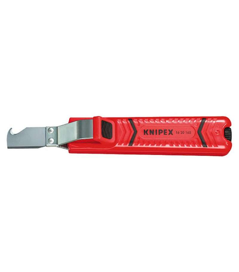 Na odstraňovanie plášťov všetkých bežných káblov kruhového prierezu. Samoupínacie úchyt. S nastavením hĺbky rezu pomocou nastavovacej skrutky. Samootáčivý nôž pre obvodový a pozdĺžny rez. Rezervné čepeľ v telese nástroja. Spoľahlivé uchopenie vďaka vložke z mäkkých komponentov ako ochrana proti skĺznutiu na rukoväti a úchytu. Teleso: plast, nárazuvzdorný. S nožom a hákovým britom vrátane ochrannej krytky.
