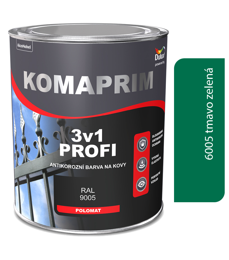 Komaprim 3v1 Profi je syntetická farba 3v1 (základ, medzináter a vrchný email) s výborným antikoróznym účinkom (bariérový a inhibičný efekt).Farba je určená ako pre vnútorné, tak aj vonkajšie použitie, a to na oceľ, zoxidovanú pozinkovanú oceľ alebo železo. Hodí sa na oceľové konštrukcie, kontajnery, strojné súčasti, strechy, brány, stĺpy atď. Dobre odoláva vlhkosti. Neobsahuje ťažké kovy. Výsledný film má pololesklý vzhľad.Vlastnosti: Výsledný vzhľad: Pololesklý. Určenie: Na vonkajšie a vnútorné použitie. Ostatné: Bez použitia základovej farby, dlhodobý antikorózny účinok. Teoretická výdatnosť: 12-14 m2/l v jednej vrstve. Počet vrstiev: 2-3 vrstvy, pre náročnejšie povrchy 3 vrstvy Zasychanie Náter je suchý na dotyk po 3 hodinách. Ďalšiu vrstvu možno nanášať najmenej po 18 hodinách. Platí pre jednu vrstvu o štandardnej hrúbke pri teplote +20 ° C a relatívnej vlhkosti vzduchu 65%, pri dobrom vetraní. Zníženie teploty alebo zvýšenie vlhkosti môže predĺžiť dobu schnutia.Riedidlo: Neriedi sa.Pracovný postup:Príprava výrobku Pred použitím farbu dôkladne premiešajte. Nepridávajte cudzie zložky, nerieďte. Príprava podkladu Povrch pred natieraním musí byť bez poškodeného náteru, jednotný, čistý, úplne suchý, odmastený, bez organických povlakov, zdrsnený a bez prachu. 1. Nátery málo priľnavých farieb je potrebné úplne odstrániť z podkladu, potom povrch umyť vodou, aby sa odstránili zvyšky prachu. Nechajte zaschnúť. 2. Z povrchu treba odstrániť nečistoty znižujúce priľnavosť farby. Znečistenie zmyte vodou so saponátom. Na mastnoty použite vhodné odmasťovadlo. Nechajte zaschnúť. 3. Povrch napadnutý hubami očistite s pomocou špachtle, a následne použite zodpovedajúci fungicídny prostriedok. 4. Nerovnosti a poškodenie povrchu vyplniťe vhodným tmelom a potom prebrúste. 5. Povrch zdrsnite brúsnym papierom a zbavte prachu. Odporúčania pre bezpečnú prípravu povrchu: Pri brúsení suchej vrstvy farby môže vznikať prach. Tam, kde je to možné, by malo byť vždy použité brúsenie za mokra. Pokiaľ sa nedá zabrániť vystaveniu účinkom pomocou lokálneho odsávania, musia byť použité vhodné respiračné ochranné prostriedky. Natieranie Podmienky natierania: Okolná teplota a teplota povrchu by mali byť v rozmedzí +10 až + 28 ° C. Relatívna vlhkosť by mala byť nižšia ako 80%. Odporúčané spôsoby natierania: Štetcom: ideálne je štetec so syntetickým vláknom. Valčekom: najlepší výsledok dosiahnete s velúrovými valčekmi s dĺžkou rúna 5-10 mm Striekaním: Farbu je možné nanášať aj vysokotlakovým striekaním Airless. Voľba parametrov pri striekaní závisí na individuálnych potrebách a vlastnostiach zariadení a mali by jej predchádzať technické skúšky.Čistenie maliarskeho náradia Čistenie pomôcok riedidlom S 6006 alebo iným bežným riedidlom. Pred čistením odstráňte zo štetca a valčeka čo najviac farby.