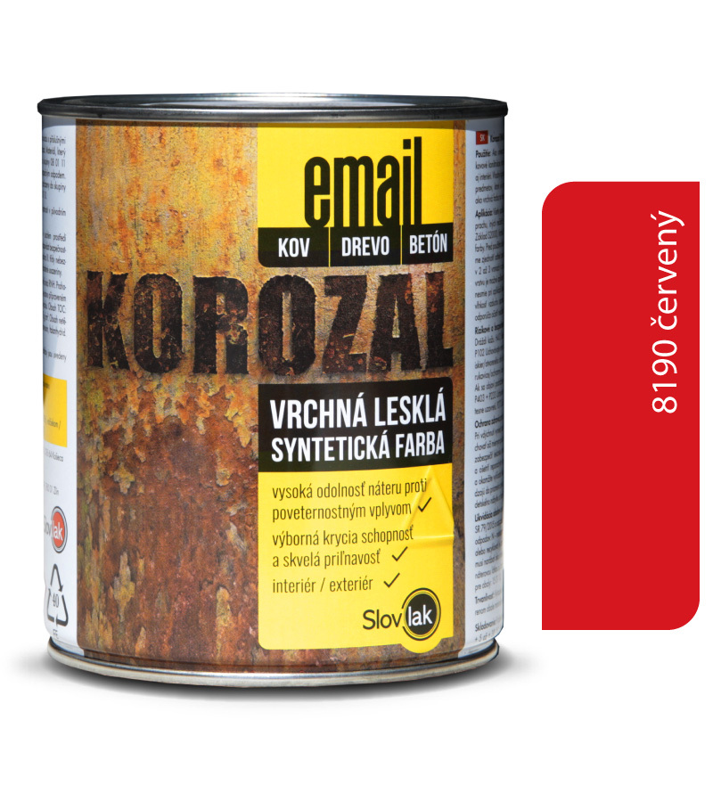 Lesklý syntetický email určený na vrchné konečné nátery hlavne kovových materiálov pre vonkajšie i vnútorné prostredie. Syntetika S2013U je vhodná aj na iné ako kovové podklady - môže sa ňou natierať drevo, betón, porézne materiály. Syntetická farba S2013U vytvára na povrchu materiálov súvislý ochranný film, ktorý je odolný voči vlhkosti a poveternostným vplyvom. Má výbornú priľnavosť na základné nátery i na staršie renovované povrchy. Vlastnosti: dokonalá ochranná bariéra voči poveternostným vplyvom trvale pružný lesklý film stabilita odtieňov vynikajúca priľnavosť na základné i staré nátery a rôzne povrchy pekný, hladký, zliaty povrch veľmi ľahká roztierateľnosť určená na vonkajšie i vnútorné použitie Príprava podkladu na náter Syntetikou S2013U: ak je predchádzajúci náter, tento musí byť suchý a čistý minimálna teplota pri aplikácii + 5° C teplota podkladu musí byť najmenej 3° C nad rosným bodom relatívna vlhkosť vzduchu v rozmedzí 30 – 70 % Ako natrieť kov Syntetikou S2013U? odstráňte okovíny, korózne splodiny, prach, soli, mastnoty a iné nečistoty - drôtenou kefou, šmirgľom, odmastenie technickým benzínom alebo liehom 1 až 2 krát natrite kov základnou farbou (Syntetika S2000, S2003, Syntetika Extra základná farba, S 2035) - vyberte farbu kontrastnú s vrchným náterom ak má kov diery, väčšie nerovnosti - tie vytmelte menšie nerovnosti vyrovnajte brúsením brúsnym papierom 1 až 3 krát natrite kov Syntetikou S2013 vrchný email Ako natrieť drevo Syntetikou S2013U? odstráňte živičné škvrny z dreva (napr. riedidlom C6000), drevo prebrúste a očistite napustite drevo impregnáciou proti škodcom a černaniu - dlhšie vydrží jemne prebrúste brúsnym papierom ako základný náter použite 1 náter Olema O 2025, alebo Syntetika S2000U základná farba po 24 hodinách jemne prebrúste brúsnym papierom (podľa potreby a požiadaviek) natrite finálnym vrchným náterom 1 až 2 krát Syntetika S2013U vrchný email Orientačná výdatnosť: cca 14 -17 m2/l v jednej vrstve pri hrúbke suchého filmu 40 μm, odporúčame natierať 2 vrstvami. Nepoužívať na nátery prichádzajúce do styku s potravinami, krmivami, pitnou vodou, na natieranie detského nábytku a hračiek.Lesk: lesklá Zasychanie: na dotyk 8 hodín, pretieranie ďalšou vrstvou 12 – 24 h Riedidlo: S6006 (natieranie), S6001(striekanie)