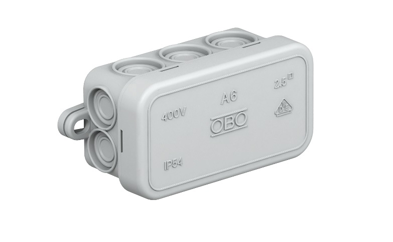 Stupeň krytia IP55, menovité napätie 400 V, menovitý prierez 2,5 mm2, 6 vývodov pre priemer kábla 5-14 mm 4 vývody pre priemer kábla 5-9 mm. Zverné veko. Rozmery: 80 x 43 x 36mm Svetlé vnútorné rozmery: 69x 32 x 30mm Na každých 10 krabíc jeden vyrezávací nástroj