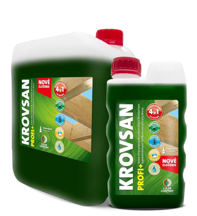 Vysokoúčinný fungicídny a insekticídny prípravok s okamžitým likvidačným a preventívnym účinkom na ochranu dreva, drevotrieskových a drevovláknitých výrobkov, rôznych drevených prvkov, drevených konštrukcií, krovov, drevostavieb, zrubov, stropov, podláh, obkladov, okien, nábytku, záhradného nábytku, plotov a iných výrobkov z dreva. Prípravok je vysoko účinný proti drevokaznému hmyzu a proti zamodreniu dreva. Je odolný voči poveternosti, je z dreva nevymývateľnýKROVSAN PROFI + je určený ako základný, ochranný a napúšťací náter dreva pod vodouriediteľné alebo syntetické laky a lazúry.KROVSAN PROFI + obsahuje alkydové spojivo a prísady. Ľahko preniká do povrchu dreva. Po uschnutí je bez zápachu.Návod na použitie: povrch dreva musí byť suchý, čistý, zbavený mastnoty a nečistôt. Pred použitím prípravok dobre premiešajte. Prípravok je pripravený priamo na použitie. Nesmie sa aplikovať na zmrznutý povrch, ani byť v priamom kontakte s pôdou alebo povrchovou vodou. Prípravok je určený na drevené fasády, okná (vnútorné aj vonkajšie časti), dvere, garáže, krovy, okenice, zábradlia a iné výrobky v exteriéri.V prípade použitia v interiéri doporučujeme použiť vrchný náter. Produkt by mal byť aplikovaný rovnomerne, aby sa dosiahli najlepšie výsledky. Doporučená teplota pre aplikáciu a podklad je od 10 – 30 ⁰C.Aplikácia: štetcom alebo valčekomVýdatnosť: z 1l prípravku cca 10 m²Čas schnutia: 4 – 6 hodín za normálnych podmienok (20⁰C). Nízke teploty, zvýšená vlhkosť a zložky niektorých typov dreva môžu zvýšiť čas schnutia.Odtieň: bezfarebný, zelený, hnedý, žltý Používajte biocídy bezpečným spôsobom. Pred použitím si vždy prečítajte etiketu a pripojené informácie o výrobku.