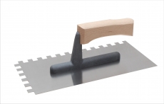Hladidlo nerezové zubové EKO LINE, sklolaminátová stopka, nerezový, kyseline odolný plech, hrúbka: 0,7 mm ergonomická, buková rukoväť na podlahy, nanášanie omietok, lepidiel a štukov.