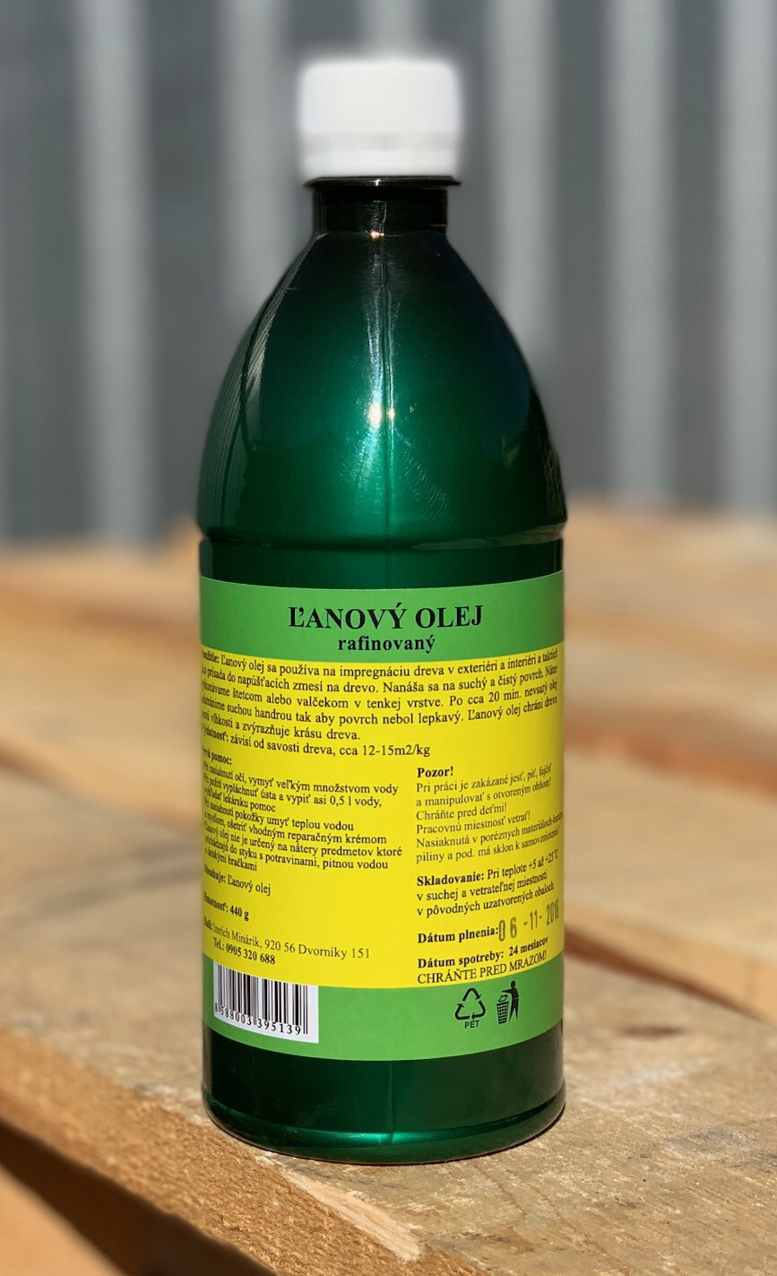 Ľanový olej sa používa na impregnáciu dreva- povrchová úprava dreva.Použitie úprava povrchov zrubov, drevostavieb, údržba drevených hudobných nástrojov, oprava historického nábytku a impregnácia sudov ako prísada do napúšťacích zmesí na drevo vhodný pre interiér aj exteriérVlastnosti náteru nízka viskozita – hlboko preniká do dreva chráni drevo pred vlhkosťou vysoká difúzna priepustnosť— drevo dýcha zvýrazňuje kresbu dreva, nepraská a nelepíRiedenie výrobok sa dodáva v konzistencii na priame použitie takže sa neriedi pracovné pomôcky možno očistiť RIEDIDLOM S6006 prípadne C6000Príprava podkladu podklad musí byť čistý, suchý, súdržný, zbavený živičných škvŕn a podľa možnosti zabrúsený nanášame 1-2 nátery po približne 10 minútach nevsiaknutý olej odstránime zotretím suchou handrou tak, aby povrch nebol lepkavý a lesklý druhý náter nanášame po dôkladnom zaschnutí prvého náteru, najskôr však po 24 hodinách pozor na možnosť samovznietenia – handry a drevené hobliny napustené ľanovým olejom sú za veľkého prístupu tepla a vzduchu samovznietivéSkladovanie doporučená aplikačná a skladovacia teplota je +5°C až + 25°C.
