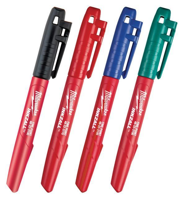 Možno používať na vlhkom, mastnom, zaprášenom, hrdzavom povrchu alebo povrchu znečistenom sutinou. Špička odolná proti opotrebeniu – akrylový hrot ideálne pre drsné povrchy, napríklad OSB a betón. Tiež vhodné pre drevo, kov, plasty a keramiku. Akrylový hrot – zachováva si ostrosť, nehoubovatí ani neustupuje pod tlakom. Atrament rýchlo schne k zníženiu rozmazávaniu. Avšak značkovače INKZALL ™ nevysychajú príliš, keď nie sú zakryté viečkom. Dizajn zabraňujúci kotúľanie pre lepšiu stabilitu na hladkých povrchoch. Tvrdá sponka na krytke – možno prichytiť na stavebné prilbu, nohavice, montérky. Otvor pre šnúrku, napr. Pre pripevnenie značkovače INKZALL ™ k opasku značkovač INKZALL ™ sa stylusom na prístroje s dotykovou obrazovkou. Netoxický atrament, certifikácia ASTM D 4236. Farba: Modrá, Červená, Zelená, ČiernaVeľkosť špičky: 1 mm