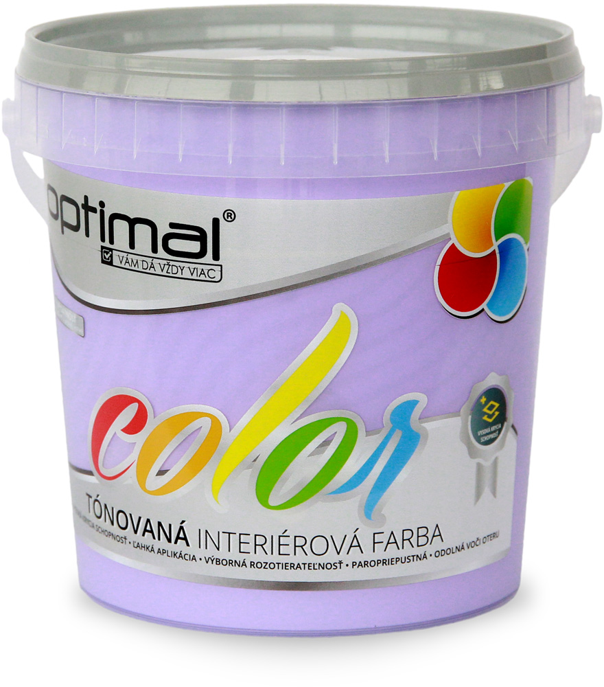 Kvalitná tónovaná, matná, oteruvzdorná, vysoko paropriepustná, rýchloschnúca interiérová disperzná farba s vysokou krycou schopnosťou a rozotierateľnosťou na okamžité použitie. Výhody: okamžitá aplikácia tónovanej farby výborná paropriepustnosť odolná voči oteru za sucha dobrá priľnavosť k minerálnym podkladom schopnosť zaceliť drobné trhliny na natieranom povrchu Použitie: Tónovaná farba Optimal Color je vhodná na vnútorné nátery vápenných, cementových a sadrových omietok, sadrokartónových, sadrovláknitých a drevovláknitých dosiek, betónových panelov, muriva, sanačných omietok, tapiet a pod. Taktiež na aplikáciu na podklady s kombináciou klasických omietok a sadrokartónu. Výrobok spĺňa požiadavky na nátery povrchov, ktoré môžu prichádzať do nepriameho styku s potravinami. Odtiene: odtiene sa aplikujú priamo, alebo sa môžu navzájom ľubovoľne miešať. Svetlejšie odtiene sa získajú zmiešaním s bielym odtieňom. Nanášanie: valčekom, štetkou, štetcom, striekaním Airless. Výdatnosť: 6–10 m2 z 1 kg farby v jednej vrstve podľa nasiakavosti a štruktúry podkladu a hrúbky vrstvy a ďalších faktorov. Teplota (farby, prostredia a podkladu): pri aplikácii a do 24 hodín po aplikácii sa musí pohybovať v rozmedzí +5 až +30 °C. Podklad: vyzretý, chemicky neutrálny, súdržný, suchý, nemastný, nezasolený, zbavený debniacich olejov, bez nečistôt a biologického napadnutia (plesne, riasy). Návod na použitie: pred aplikáciou treba farbu dobre premiešať. napúšťací náter sa vytvorí zriedením farby max. 0,3 l vody na 1 kg farby, a to podľa použitej aplikačnej techniky. Pri extrémne hladkých podkladoch (sadrokartónové, sadrové stierky a pod.) sa pre napúšťací náter používa penetračný prípravok. Ak je podkladom súdržný, nesprašujúci, málo nasiakavý pôvodný náter, napúšťací náter nie je nutný. Vrstvy starých náterov s malou prídržnosťou treba najprv oškrabať. po zaschnutí napúšťacieho náteru sa nanesú 1 až 2 nátery, podľa potreby aj viaceré krycie nátery farbou zriedenou max. 0,1 l vody na 1 kg farby. všetky pomôcky pri pracovných prestávkach treba chrániť proti zaschnutiu a po práci umyť vodou. Doba zasychania (20 °C, rel. vlhkosť vzduchu 60 % obj.): min. 4 hod. Podrobnosti sú uvedené v technickom liste výrobku. Bezpečnosť: obsahuje biocídne výrobky (konzervácia obalu). Obsahuje 3-jód-2-propynyl butylkarbamát. Obsahuje 1,2-benzizotiazol-3(2H)-ón a reakčnú zmes zloženú z týchto látok: 5-chlór-2-metyl-4-izotiazolín-3-ón a 2-metyl-2H-izotiazol-3-ón (3:1). Môže vyvolať alergickú reakciu. Uchovávajte mimo dosahu detí. Odporúčame používať ochranné okuliare a pracovný odev. Pri nanášaní a schnutí dôkladne vetrajte. Pri aplikácii striekaním nevdychujte aerosóly. Prvá pomoc: zasiahnuté oči vypláchnite vodou. Pri požití vypláchnite ústa vodou. Postriekanú pokožku umyte vodou a mydlom. Pri ťažkostiach vyhľadajte lekára. Ak je potrebná lekárska pomoc, majte k dispozícii obal alebo etiketu výrobku. Likvidácia odpadov: Zneškodnite obsah/nádobu v súlade s miestnymi predpismi odovzdaním osobe oprávnenej na likvidáciu odpadu alebo na miesto určené obcou. VOC: ≤1,3 hm.%. Hraničná hodnota VOC kat. A (a) VR: 30 g/l. Max. obsah VOC vo výrobku v stave pripravenom na použitie: ≤18 g/l. Hustota: cca 1,5 – 1,8 g/cm3. Skladovanie: v suchu, pri +3 až +30 °C, nesmie zmrznúť, chrániť pred priamym slnečným žiarením. Vznik jemného bieleho závoja na vnútornej strane obalu neznamená zníženú kvalitu výrobku. Dátum spotreby: v pôvodnom neotvorenom obale do dátumu uvedeného na obale (EXP.). Tolerancia plnenia: ±2 %.Výdatnosť: 6 – 10 m2/kg v jednej vrstve Doba schnutia: 2 – 4 h pri 20 °C a 60 % relatívnej vlhkosti vzduchu Skladovanie: pri teplotách nad +3 až +30 °C, nesmie zmrznúť, chrániť pred priamym slnečným žiarenímím. Balenie: plastové vedrá 1,5 kg, 4 kg, 7,5 kg