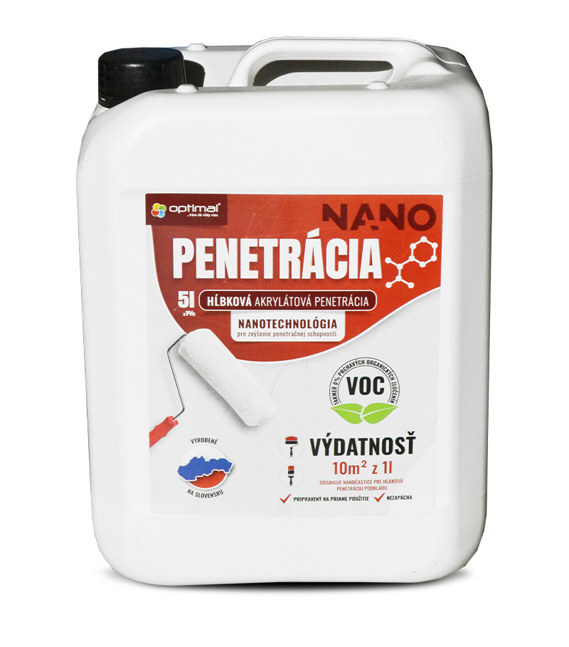 Optimal Nano Penetrácia je hĺbkový penetračný náter pripravený na okamžité použitie. Obsahuje nanočastice, ktoré zabezpečujú vynikajúci prienik a následné spevnenie podkladovej vrstvy. Zjednocuje tiež nasiakavosť podkladu a zabezpečuje vysokú priepustnosť vodných pár. Používa sa ako základný náter pod farby, stierky, omietky, samonivelizačné hmoty, betón a podobne v interiéroch aj v exteriéroch. Penetrácia má výdatnosť cca 10m2 z 1l penetračného náteru. Náter je bezfarebný, neriedi sa, je pripravený k okamžitému použitiu. Náter sa môže nanásať valcom alebo štetcom. Dostupné balenia: 1l, 3l, 5l, 10l