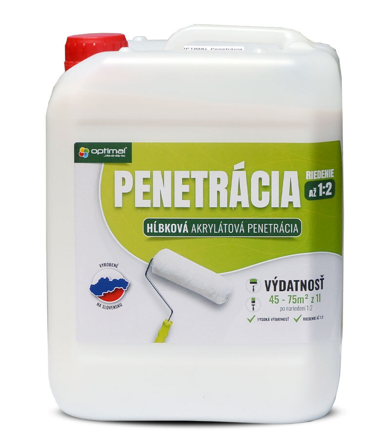 Hĺbková akrylátová penetrácia s riedením do 1:2 na 225-375m2.HĹBKOVÁ AKRYLÁTOVÁ PENETRÁCIA na spevnenie savých podkladov ako sú omietka, sadrokartón, betón a pod. Penetračný prostriedok je určený na hĺbkové spevnenie podkladu, potlačuje vzlínanie rozpustných solí podkladu, zjednocuje savosť, spája nekompaktné časti podkladu, spevňuje podklad a zvyšuje priľnavosť k vrchnému náteru. Výdatnosť:1:1 – 25-50m2/l1:2 – 45-75m2/lVhodný na aplikáciu v interiéri aj v exteriéri. Aplikácia: Penetračný prostriedok sa aplikuje na porézne podklady ako sú betón, vápenné, vápenno cementové, cementové a disperzné omietky, sadrokartón. Pred penetráciou musí byť povrch dokonale očistený od prachu a rôznych nečistôt, suchý a vyzretý. Penetračný prostriedok sa riedi vodou v pomere 1:1 (veľmi savé podklady) až 1:2 podľa savosti podkladu. Aplikuje sa pri teplote od 5°C do 25°C bez priameho slnečného pôsobenia. Povrch má byť penetračným prostriedkom nasýtený, ale na povrchu nesmie zostať vrstva nevstrebaného prostriedku. Aplikuje sa štetkou alebo valčekom. Pracovné prostriedky sa ihneď po ukončení práce umyjú vodou. Likvidácia odpadu a obalu: Likvidujte v súlade so zákonom o odpadoch ako nie nebezpečný odpad. Prázdny obal odovzdajte v zbernom mieste. Bezpečnosť pri práci: Pri práci nejedzte, nepite ani nefajčíte. Zabezpečte vetranie. Noste vhodný ochranný odev a rukavice. Zabráňte kontaktu s pokožkou a očami.