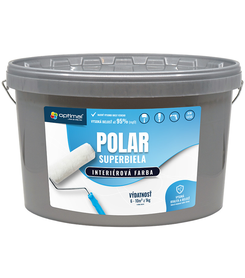 Snehovo biela, matná, oteru vzdorná, vysoko paropriepustná, rýchloschnúca interiérová disperzná farba s vysokou krycou schopnosťou a rozotierateľnosťou, vhodná na nátery omietok sanačných systémov. Výhody farby Optimal Polar: vysoká belosť 94 % (MgO) ľahká tónovateľnosť odolnosť voči oterom za sucha dobrá priľnavosť k minerálnym podkladom vynikajúca paropriepustnosť (odporúčaná na sanačné omietky KNAUF) spĺňa požiadavky smernice WTA na povrchové vrstvy sanačných omietok (Sd = 0,09 m) Výdatnosť Optimal Polar: 6 – 10 m2/kg v jednej vrstve Doba schnutia: 2 – 4 h pri 20 °C a 60 % relatívnej vlhkosti vzduchu Skladovanie: pri teplotách nad +3 až +30 °C, nesmie zmrznúť, chrániť pred priamym slnečným žiarením. Balenie: V plastových vedrách hmotnosti 3 kg, 6 kg, 10 kg, 15 kg, 15+3 kg, 25 kg, 40kg