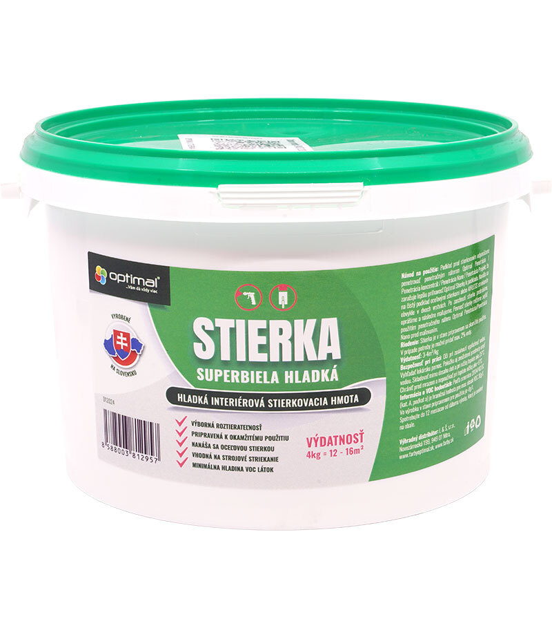 Stierková hmota, sa používa na vnútorné povrchové úpravy bytových, občianskych a priemyselných stavieb. Vhodnými podkladmi sú betón, pórobetón, sadrokartón a ostatné silikátové podklady. Nie je vhodná na nanášanie na umakart. Dodáva sa k priamemu použitiu v pastovitej konzistencii a svetlom prevedení, bez zhlukov a nerozmiešaných spojív. Je možné ju používať ako podkladovú vrstvu pod maľby, tapety alebo ako konečnú povrchovú úpravu. Podklady musia byť pevné, čisté a zbavené prachu. Poškodené miesta, ktoré sú hlbšie ako 3mm, musia byť pred nanášaním stierky vyspravené. Podklady je pred aplikáciou stierky vhodné napenetrovať. Stierka sa môže nanášať striekacími zariadeniami na omietkové hmoty, alebo ručne pomocou murárskych hladítok do hrúbky max. 1,5 – 2mm. V prípade potreby po zatvrdnutí je možné stierkovú hmotu naniesť aj druhýkrát. Výdatnosť je 1,8kg/m2 pri hrúbke 1,5mm Balenie: 1,8kg, 4kg, 7kg, 15kg, 30kg