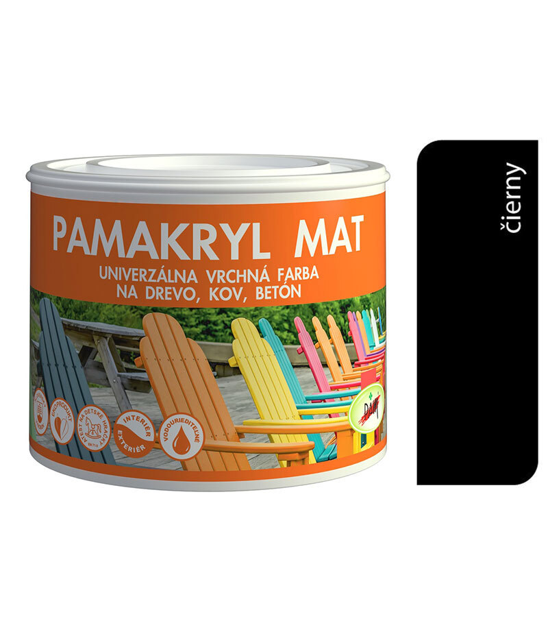 Vodouriediteľná farba určená na polomatné povrchové úpravy drevených a po predchádzajúcej antikoróznej úprave aj kovových materiálov v interiéri a exteriéri.Farba je určená na polomatné povrchové úpravy drevených a kovových materiálov v interiéri a exteriéri. Pri povrchovej úprave drevených materiálov, doporučujeme použiť Základnú farbu na drevo a pri úprave kovových materiálov, doporučujeme použiť antikorózny náter Kovokryl. Pamakryl Mat je vhodný na povrchovú úpravu stierok, murív, betónov, plynosilikátov, tehál, vláknito – cementových dosiek, sadrokartónov, lepeniek a papiera.Pamakryl Mat je možné použiť na povrchovú úpravu materiálov v potravinárskych prevádzkach /len pre nepriamy styk s potravinami/ a zdravotníckych zariadeniach po vysušení a odvetraní. Pamakryl MAT spĺňa limitné hodnoty podľa EN 71-3:2013, kategórie III. pre povrchovú úpravu hračiek.Podmienky aplikácie:Teplota vzduchu pri aplikácii musí byť vyššia ako +8oC arelatívnu vlhkosťvzduchu nižšia ako 70%.Nanáša sa štetcom, valcom, striekaním. Nízka teplota avysoká relatívna vlhkosť spomaľujú zasychanie. Priemyselné aplikáciesa posudzujú individuálne vzávislosti od podkladu,na ktorom sa vykonáva povrchová úprava.Postup:Povrch musí byť suchý, pevný, zbavený nečistôt, mastnoty, hrdze, zbytkov starých náterov.Pri natieraní väčších plôch dôkladne zmiešaťobsah všetkých obalov, dosiahnesatak zjednotený odtieň. Pracovné pomôcky ihneď po použití umyť vodou. Schnutie medzi jednotlivými nátermi 4-6 hodín. Riedenie vodou max. do 10 hm.% vody.Náter na omietku,betón,sadrokartón apod.: Podklad ošetriť penetračnou emulziou Pamakryl PEFzriedenou čistou vodou 1:1. V prípade následného nanášania sýteho odtieňa Pamakrylu MAT doporučujeme podklad penetrovať Pamakrylom PEF zriedeným vodou 2:1. Následne 2 nátery Pamakrylom MAT.Náter na neošetrené drevo: Drevo ošetriť fungicídnym ainsekticídnym prostriedkom Impregnit Profi+na ochranu proti plesniam,hubám a drevokaznému hmyzu. Po vyschnutí vykonať základný náter Základnou farbou na drevo v jednej alebo dvoch vrstvách. Jednotlivé vrstvy po zaschnutí prebrúsiť brúsnym papierom č.150-180. Brúsny prach dôkladne odstrániť.Následne dva nátery Pamakrylom MAT.Náter na kov, pozinkovaný plech: Dva nátery antikoróznou farbou Kovokryl, resp. Kovozin na pozinkovaný plech. Následne dva nátery Pamakrylom MAT.Výdatnosť:6 – 8 m2 /kg na jednu vrstvu v závislosti od savosti podkladu