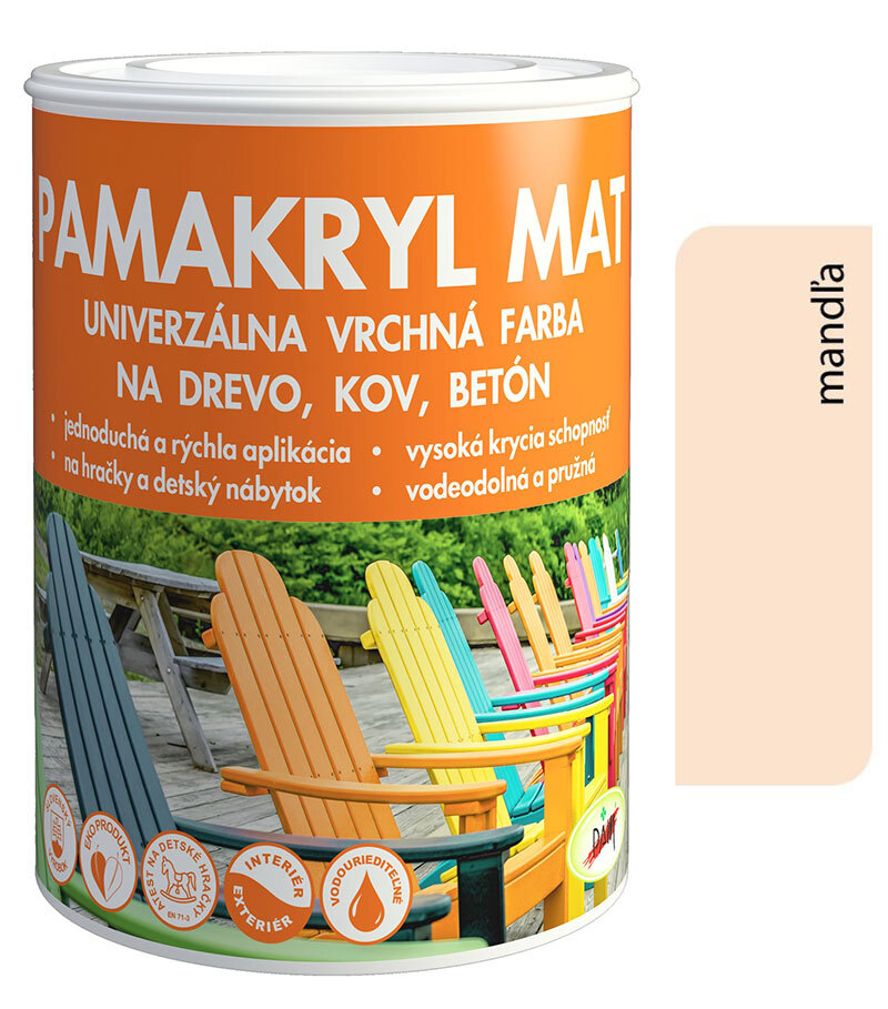 Vodouriediteľná farba určená na polomatné povrchové úpravy drevených a po predchádzajúcej antikoróznej úprave aj kovových materiálov v interiéri a exteriéri.Farba je určená na polomatné povrchové úpravy drevených a kovových materiálov v interiéri a exteriéri. Pri povrchovej úprave drevených materiálov, doporučujeme použiť Základnú farbu na drevo a pri úprave kovových materiálov, doporučujeme použiť antikorózny náter Kovokryl. Pamakryl Mat je vhodný na povrchovú úpravu stierok, murív, betónov, plynosilikátov, tehál, vláknito – cementových dosiek, sadrokartónov, lepeniek a papiera.Pamakryl Mat je možné použiť na povrchovú úpravu materiálov v potravinárskych prevádzkach /len pre nepriamy styk s potravinami/ a zdravotníckych zariadeniach po vysušení a odvetraní. Pamakryl MAT spĺňa limitné hodnoty podľa EN 71-3:2013, kategórie III. pre povrchovú úpravu hračiek.Podmienky aplikácie:Teplota vzduchu pri aplikácii musí byť vyššia ako +8oC arelatívnu vlhkosťvzduchu nižšia ako 70%.Nanáša sa štetcom, valcom, striekaním. Nízka teplota avysoká relatívna vlhkosť spomaľujú zasychanie. Priemyselné aplikáciesa posudzujú individuálne vzávislosti od podkladu,na ktorom sa vykonáva povrchová úprava.Postup:Povrch musí byť suchý, pevný, zbavený nečistôt, mastnoty, hrdze, zbytkov starých náterov.Pri natieraní väčších plôch dôkladne zmiešaťobsah všetkých obalov, dosiahnesatak zjednotený odtieň. Pracovné pomôcky ihneď po použití umyť vodou. Schnutie medzi jednotlivými nátermi 4-6 hodín. Riedenie vodou max. do 10 hm.% vody.Náter na omietku,betón,sadrokartón apod.: Podklad ošetriť penetračnou emulziou Pamakryl PEFzriedenou čistou vodou 1:1. V prípade následného nanášania sýteho odtieňa Pamakrylu MAT doporučujeme podklad penetrovať Pamakrylom PEF zriedeným vodou 2:1. Následne 2 nátery Pamakrylom MAT.Náter na neošetrené drevo: Drevo ošetriť fungicídnym ainsekticídnym prostriedkom Impregnit Profi+na ochranu proti plesniam,hubám a drevokaznému hmyzu. Po vyschnutí vykonať základný náter Základnou farbou na drevo v jednej alebo dvoch vrstvách. Jednotlivé vrstvy po zaschnutí prebrúsiť brúsnym papierom č.150-180. Brúsny prach dôkladne odstrániť.Následne dva nátery Pamakrylom MAT.Náter na kov, pozinkovaný plech: Dva nátery antikoróznou farbou Kovokryl, resp. Kovozin na pozinkovaný plech. Následne dva nátery Pamakrylom MAT.Výdatnosť:6 – 8 m2 /kg na jednu vrstvu v závislosti od savosti podkladu