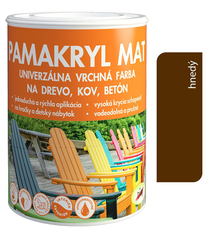 Vodouriediteľná farba určená na polomatné povrchové úpravy drevených a po predchádzajúcej antikoróznej úprave aj kovových materiálov v interiéri a exteriéri.Farba je určená na polomatné povrchové úpravy drevených a kovových materiálov v interiéri a exteriéri. Pri povrchovej úprave drevených materiálov, doporučujeme použiť Základnú farbu na drevo a pri úprave kovových materiálov, doporučujeme použiť antikorózny náter Kovokryl. Pamakryl Mat je vhodný na povrchovú úpravu stierok, murív, betónov, plynosilikátov, tehál, vláknito – cementových dosiek, sadrokartónov, lepeniek a papiera.Pamakryl Mat je možné použiť na povrchovú úpravu materiálov v potravinárskych prevádzkach /len pre nepriamy styk s potravinami/ a zdravotníckych zariadeniach po vysušení a odvetraní. Pamakryl MAT spĺňa limitné hodnoty podľa EN 71-3:2013, kategórie III. pre povrchovú úpravu hračiek.Podmienky aplikácie:Teplota vzduchu pri aplikácii musí byť vyššia ako +8oC arelatívnu vlhkosťvzduchu nižšia ako 70%.Nanáša sa štetcom, valcom, striekaním. Nízka teplota avysoká relatívna vlhkosť spomaľujú zasychanie. Priemyselné aplikáciesa posudzujú individuálne vzávislosti od podkladu,na ktorom sa vykonáva povrchová úprava.Postup:Povrch musí byť suchý, pevný, zbavený nečistôt, mastnoty, hrdze, zbytkov starých náterov.Pri natieraní väčších plôch dôkladne zmiešaťobsah všetkých obalov, dosiahnesatak zjednotený odtieň. Pracovné pomôcky ihneď po použití umyť vodou. Schnutie medzi jednotlivými nátermi 4-6 hodín. Riedenie vodou max. do 10 hm.% vody.Náter na omietku,betón,sadrokartón apod.: Podklad ošetriť penetračnou emulziou Pamakryl PEFzriedenou čistou vodou 1:1. V prípade následného nanášania sýteho odtieňa Pamakrylu MAT doporučujeme podklad penetrovať Pamakrylom PEF zriedeným vodou 2:1. Následne 2 nátery Pamakrylom MAT.Náter na neošetrené drevo: Drevo ošetriť fungicídnym ainsekticídnym prostriedkom Impregnit Profi+na ochranu proti plesniam,hubám a drevokaznému hmyzu. Po vyschnutí vykonať základný náter Základnou farbou na drevo v jednej alebo dvoch vrstvách. Jednotlivé vrstvy po zaschnutí prebrúsiť brúsnym papierom č.150-180. Brúsny prach dôkladne odstrániť.Následne dva nátery Pamakrylom MAT.Náter na kov, pozinkovaný plech: Dva nátery antikoróznou farbou Kovokryl, resp. Kovozin na pozinkovaný plech. Následne dva nátery Pamakrylom MAT.Výdatnosť:6 – 8 m2 /kg na jednu vrstvu v závislosti od savosti podkladu