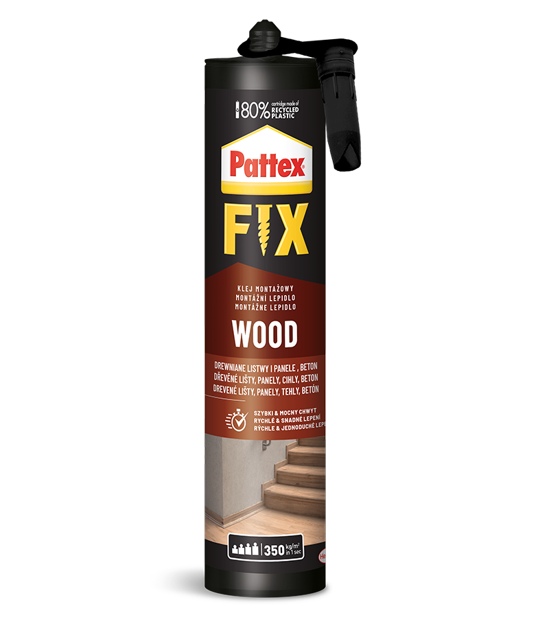 Pattex FIX Wood je montážne disperzné lepidlo na lepenie dreva a iných nasiakavých materiálov v interiéri. Pattex FIX Wood je disperzné montážne lepidlo do intriéru s vysokou počiatočnou priľnavosťou ku drevu. Ja vhodné na lepenie nasiakavých materiálov ako je drevo a drevené materiály (napr. panely, profily, drevotrieskové dosky), omietky (vnútroné), betón, pórobetón, pemza, tehla a iné nasiakavé materiály. Balenie: kartuša 385 g Popis: Vhodný na lepenie nasiakavých materiálov Počiatočná priľnavosť* 350 kg/m², počas schnutia nie je potrebná mechanická fixácia Vysoká priľnavosť na drevené povrchy Rýchloschnúce na nasiakavých povrchoch Jednoduché a rýchle očistenie z povrchov Bez rozpúštadiel – ideálny aj na citlivé povrchy (napr. polystyrén) Bez zápachu – ideálny na lepenie v obytných priestoroch Vypĺňa medzery až do 10 mm 80 % kartuše je vyrobených z recyklovaného plastu* Interná laboratórna metóda společnosti Henkel: 35 g/cm² Skladovateľnosť: 18 mesiacov pri skladovaní chladnom mieste. Chráňte pred mrazom.