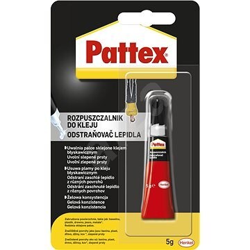 Pattex Odstraňovač lepidla je produkt na báze rozpúšťadla, ktoré je vhodné na odstraňovanie mnoho druhov lepidiel zo zašpinených alebo zle zalepených objektov. Účinné rozpúšťadlo pôsobí na zvyšky lepidiel (kyanoakrylátov), ktoré ešte vo väčšej miere nepoškodili povrchy plastov a iných materiálov. Slúži na uvoľnenie prstov, zlepených sekundovými lepidlami.VLASTNOSTI uvoľňuje zalepené prsty odstraňuje a čistí zvyšky kyanoakrylátových lepidiel a väčšinu náhodne zašpinených neporéznych povrchov odstraňuje atrament a škvrny od permanentných popisovačov vhodný aj na aplikácie na vertikálne povrchy odstráni lepidlo aj s textilu