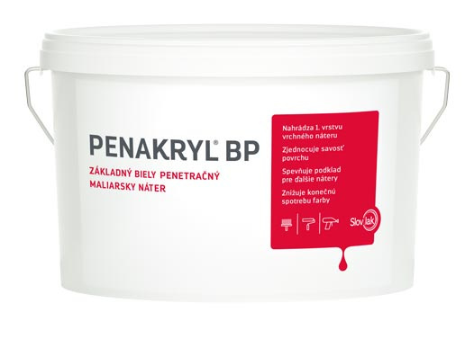 Biela penetrácia, ktorá penetruje a zároveň nahrádza prvú vrstvu náteru.Vlastnosti bielej penetrácie Penakryl BP: nahrádza 1. vrstvu vrchného náteru zjednocuje savosť povrchu spevňuje podklad pre ďalšie nátery znižuje konečnú spotrebu farby Penakryl BP je vhodný na vnútorné nátery minerálnych a sadrových omietok, sadrokartónových a drevotrieskových dosiek, betónových panelov. Vhodný je tiež na premaľovanie starších maľoviek ale aj na premaľovanie sýtych odtieňov. Nie je vhodný pre nátery, ktoré prichádzajú do priameho styku s potravinami, krmivami, pitnou vodou a na nátery detského nábytku a hračiek.Riedenie: max. 15% (pri sadrových omietkach 20%) Výdatnosť: 10-12m2/kg Zasychanie/pretierateľné: 2-4 hod.