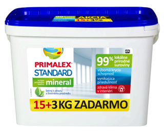 Primalex štandard 15+3kg je maliarsky náter – vodná suspenzia kaolínu, kriedy, karboxymetylcelulózy a chemických aditív. Tradičný náter klasického typu pre nenáročné aplikácie. Neuzaviera priechod vodným parám. Používa sa na omietky vo vnútorných priestoroch, najmä chodby, garáže, sklady, priemyselné priestory. Aplikácia maliarskou štetkou, striekaním, valčekom. Výdatnosť: 12,5 – 16 m2/kg v jednej vrstve. Odporúčame aplikáciu v dvoch vrstvách