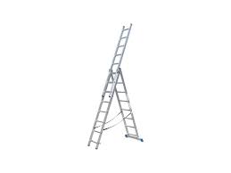 Prevedenie výrobku strieborná farba, hliník rebrík, trojdielny, hliníkový, oporný, ľahký, skladací, výsuvný. Špecifikácia - pracovná výška do cca 5 m - prípustné zaťaženie 150 kg - 3-elementová nosná konštrukcia - pevné kovové zaisťovacie západky - protišmykové nožičky vyrobené z odolných polymérov - profilované protišmykové schody - široký stabilizátor v základni