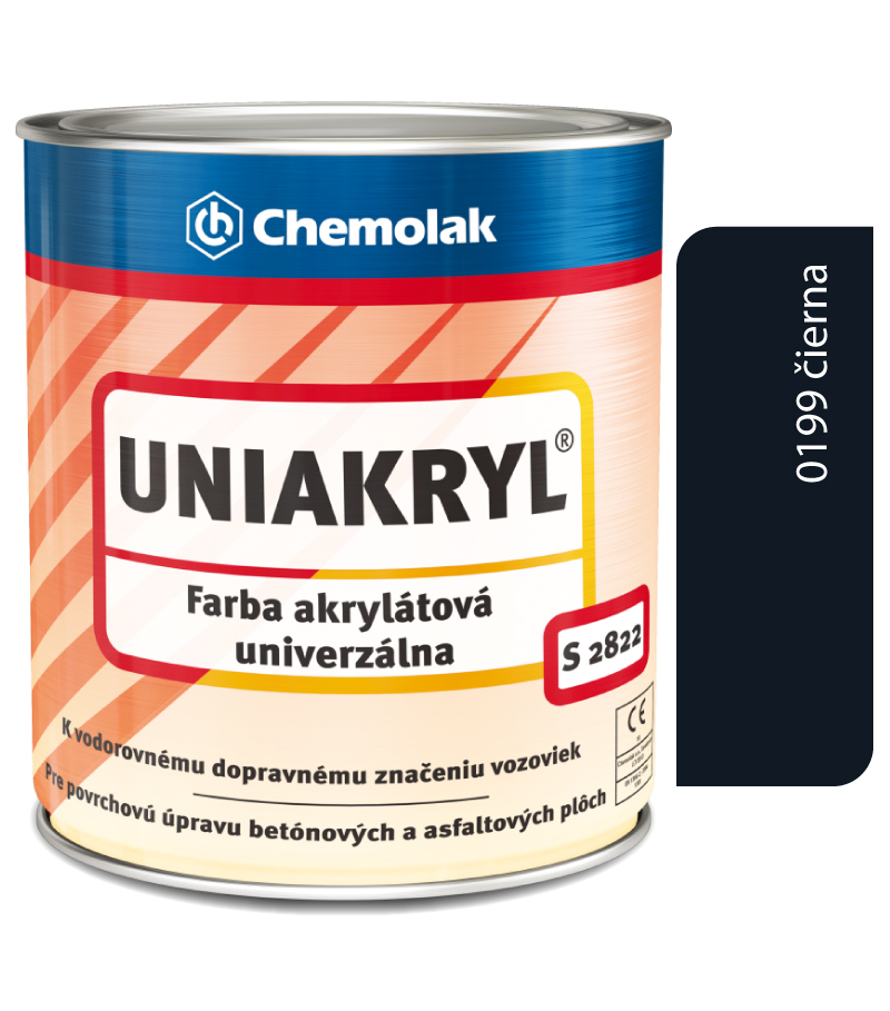Uniakryl S2822 akrylátová farba sa používa hlavne na vodorovné dopravné značenie vozoviek, chodníkov, dlažieb a iných asfaltových a betónových plôch. Pre svoje dobréoteruvzdorné vlastnosti, odolnosť voči poveternosti, chemikáliám (rôznym soliam), vyšším i nízkym teplotám je určená tiež na povrchovú úpravu vláknocementu, betónových podláh v pivniciach, garážach, skladoch a pod. Vlastnosti: výborná odolnosť voči poveternostným vplyvom odolná voči pôsobeniu posypových solí odoláva výkyvom teplôt vyniká veľmi dobrou oteruvzdornosťou trvanlivosť náterov svetlostálosť farebných odtieňov protišmykové vlastnosti Orientačná výdatnosť: cca 6 – 9 m2/l, pre VDZ 3 – 4,5 m2/l Lesk: matná Zasychanie: na dotyk 20 min, pretieranie 1 h Riedidlo: C6000 Balenie: 0,75 l, 5 kg, 10 kg, 25 kg, 75 kg