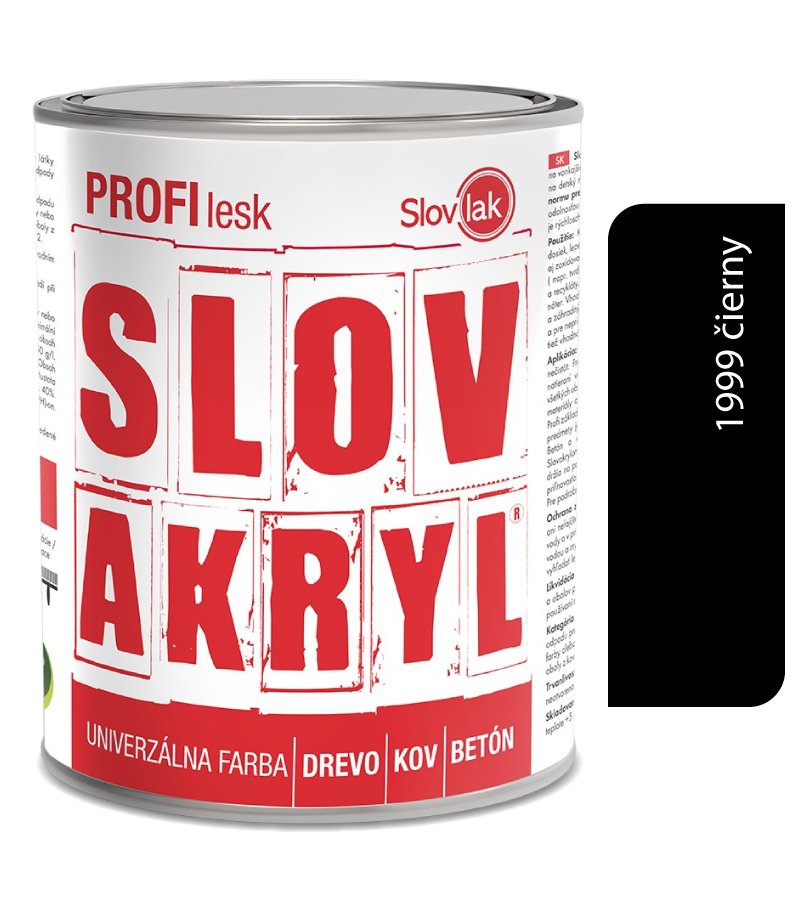 Univerzálna vodou riediteľná farba vhodná na vonkajšie a vnútorné nátery s dekoratívnym účinkom. Na povrchovú úpravu dreva, drevovláknitých a drevotrieskových dosiek, lepenky, omietok, betónu, kovu a pod. Na nátery okien, dverí, hračiek, detského nábytku, bytových a záhradných doplnkov Na kovové predmety opatrené vhodnou antikoróznou základnou farbouVšetky podklady musia byť pevné, suché, odmastené a zbavené nečistôt. Pred použitím je potrebné obsah obalu dokonale premiešať! Pri natieraní väčších plôch je potrebné zjednotiť odtieň zmiešaním obsahu všetkých obalov! Nanášame 2-3 nátery pri teplote +10 až +30 °C. Drevené materiály odporúčame pred použitím vrchného náteru natrieť Slovakrylom profi základ a po zaschnutí prebrúsiť brúsnym papierom č. 120 – 180. Kovové predmety je potrebné ošetriť vhodným základným antikoróznym náterom. Betón a omietky (dostatočne vyzreté, pevné a nedrobivé) napustiť Slovakrylom zriedeným vodou v pomere 1:1. Staré nátery, ktoré pevne držia na podklade je potrebné očistiť, prebrúsiť a odmastiť . Nátery so zlou priľnavosťou odstrániť až na podklad. Použité pomôcky ihneď umyť vodou.Výdatnosť: 6 – 9 m2/kg na jednu vrstvuZasychanie:4 – 6 hodínRiedenie:vodouBalenie:4 kg a 7,5 kgSkladovanie: V pôvodných obaloch pri teplote +5 až +30 °C. Chrániť pred mrazom!