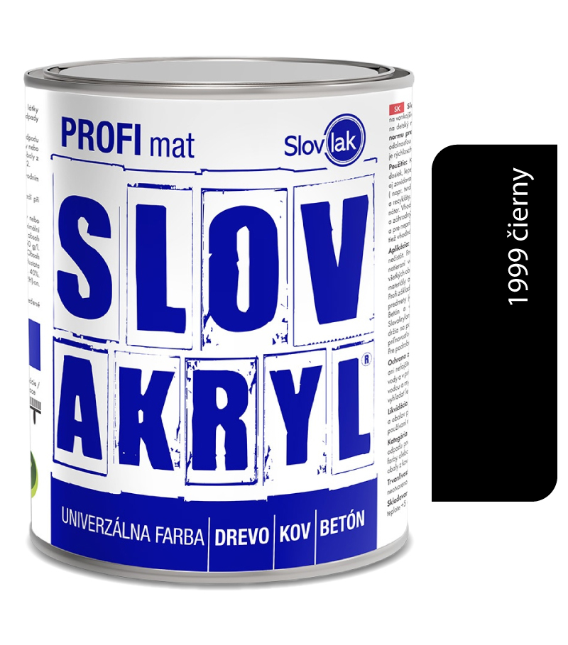 Univerzálna vodou riediteľná farba vhodná na vonkajšie a vnútorné nátery s dekoratívnym účinkom. Na povrchovú úpravu dreva, drevovláknitých a drevotrieskových dosiek, lepenky, omietok, betónu, kovu a pod. Na nátery okien, dverí, hračiek, detského nábytku, bytových a záhradných doplnkov Na kovové predmety opatrené vhodnou antikoróznou základnou farbouVšetky podklady musia byť pevné, suché, odmastené a zbavené nečistôt. Pred použitím je potrebné obsah obalu dokonale premiešať! Pri natieraní väčších plôch je potrebné zjednotiť odtieň zmiešaním obsahu všetkých obalov! Nanášame 2-3 nátery pri teplote +10 až +30 °C. Drevené materiály odporúčame pred použitím vrchného náteru natrieť Slovakrylom profi základ a po zaschnutí prebrúsiť brúsnym papierom č. 120 – 180. Kovové predmety je potrebné ošetriť vhodným základným antikoróznym náterom. Betón a omietky (dostatočne vyzreté, pevné a nedrobivé) napustiť Slovakrylom zriedeným vodou v pomere 1:1. Staré nátery, ktoré pevne držia na podklade je potrebné očistiť, prebrúsiť a odmastiť . Nátery so zlou priľnavosťou odstrániť až na podklad. Použité pomôcky ihneď umyť vodou.Výdatnosť: 6 – 9 m2/kg na jednu vrstvuZasychanie:4 – 6 hodínRiedenie:vodouBalenie: 0,75kg a 5kgSkladovanie: V pôvodných obaloch pri teplote +5 až +30 °C. Chrániť pred mrazom!